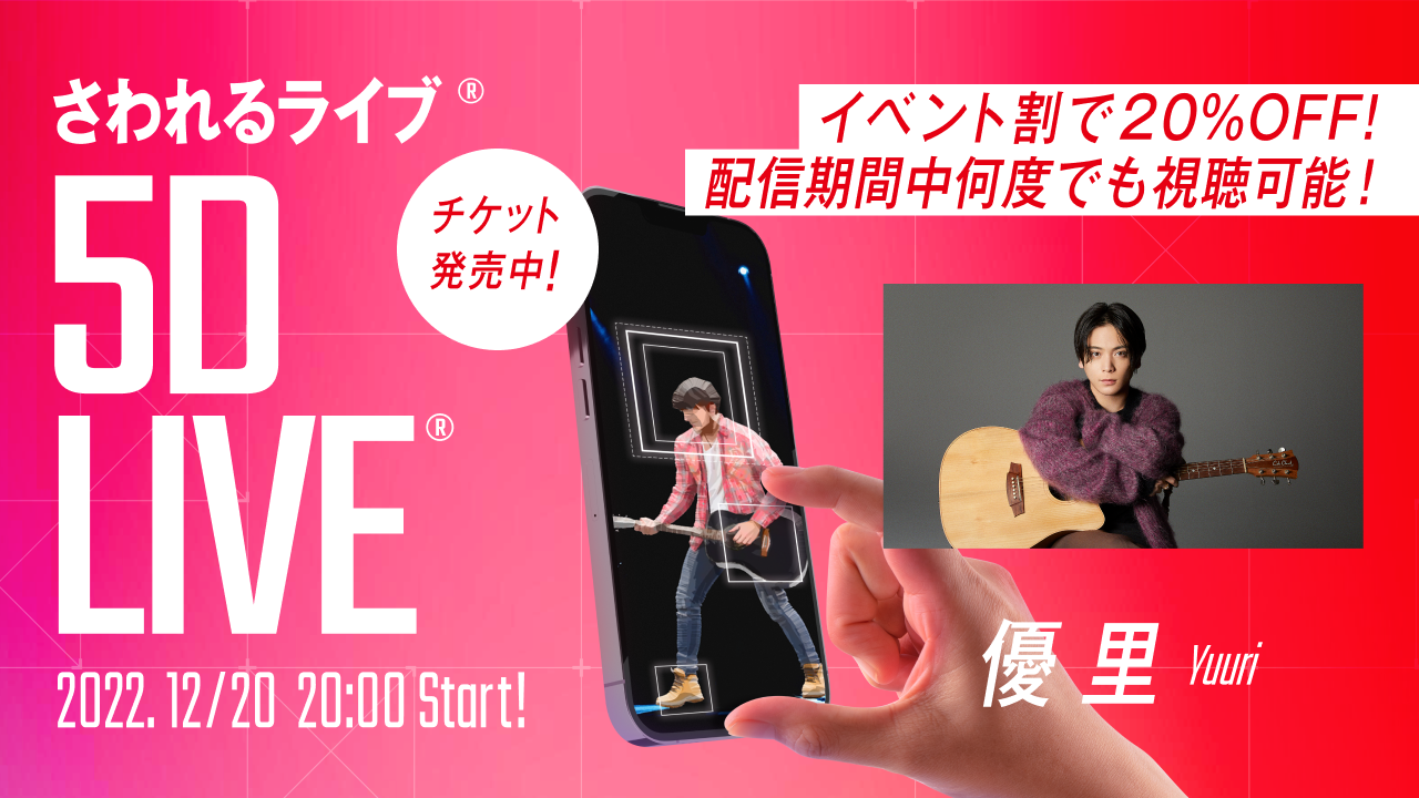 ■ イベント名 :「5D LIVE® × 優里 Xmasワンマンライブ」 ■ 出演アーティスト : 優里 ■ 視聴方法 : 5D LIVE専用アプリ(iOS, Android)にて視聴(12月リリース予定) ■ 開催日時 : 2022年12月20日(火)20:00開演 ■ 見逃し配信 : 当日配信終了後〜2022年12月21日(水)23:59まで ■ 公式サイト : https://5dlive.birdman.tokyo/yuuri/ ■ チケット販売サイト : 公式サイト、チケットぴあにて販売 ■ 企画・提供 : Birdman / 太陽企画 |