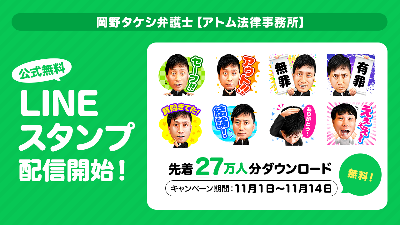 この度、アトム法律事務所は公式無料LINEスタンプの配信を開始しました。YouTubeチャンネル『岡野タケシ弁護士【アトム法律事務所】』におけるネタを網羅し、「結論!」「質問来てた!」などお馴染みのフレーズをLINEで使うことができます。