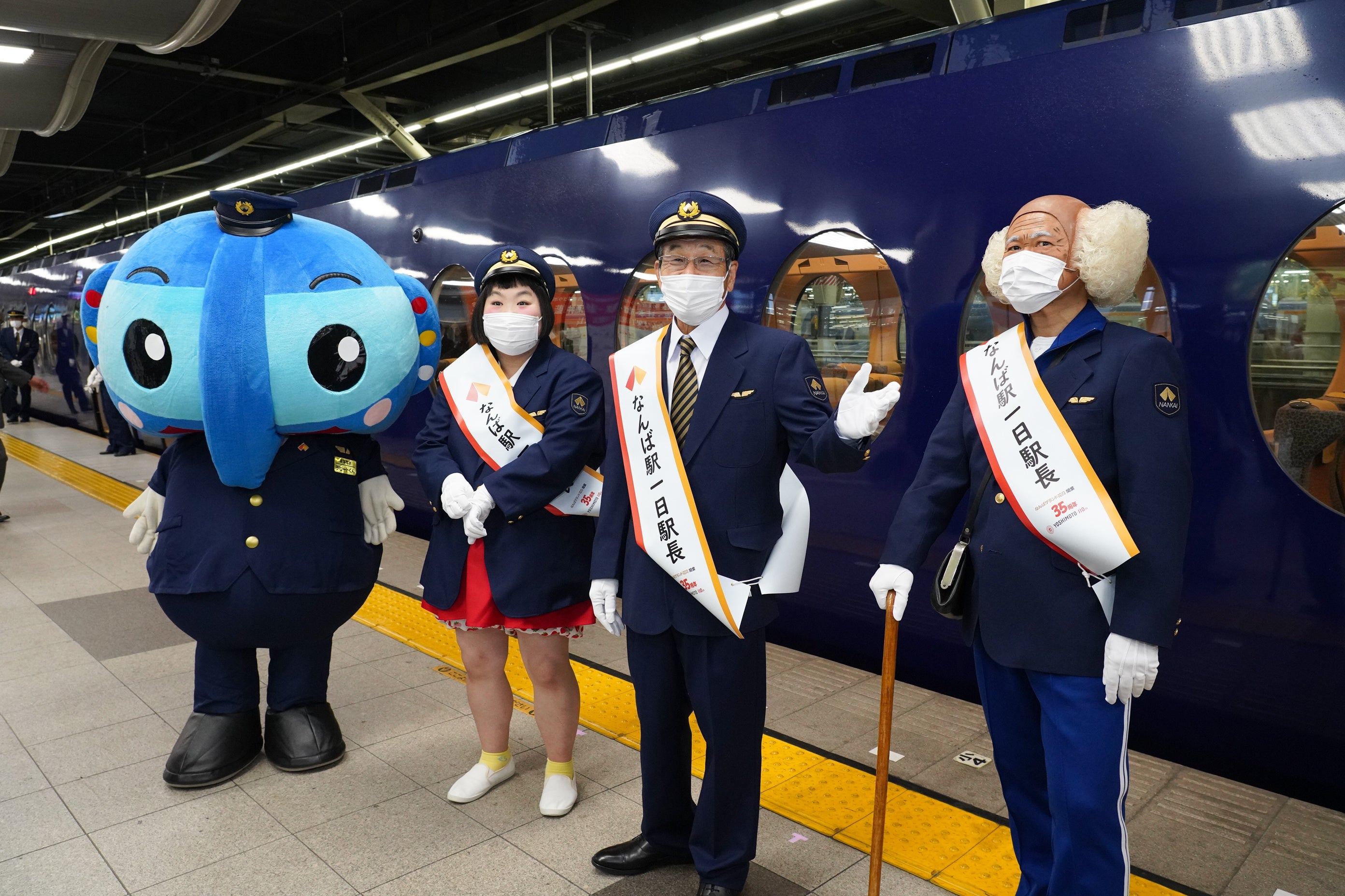 就任式では南海電鉄・大家和也駅長から3人にタスキと帽子、そして白手袋が授与されました。「寛平さんは違和感ありませんね。辻本さん、藍さんもユーモラスな着こなしです」という大家駅長のご感想どおり、寛平は駅員姿が板についており、ギャラリーを沸かせました。