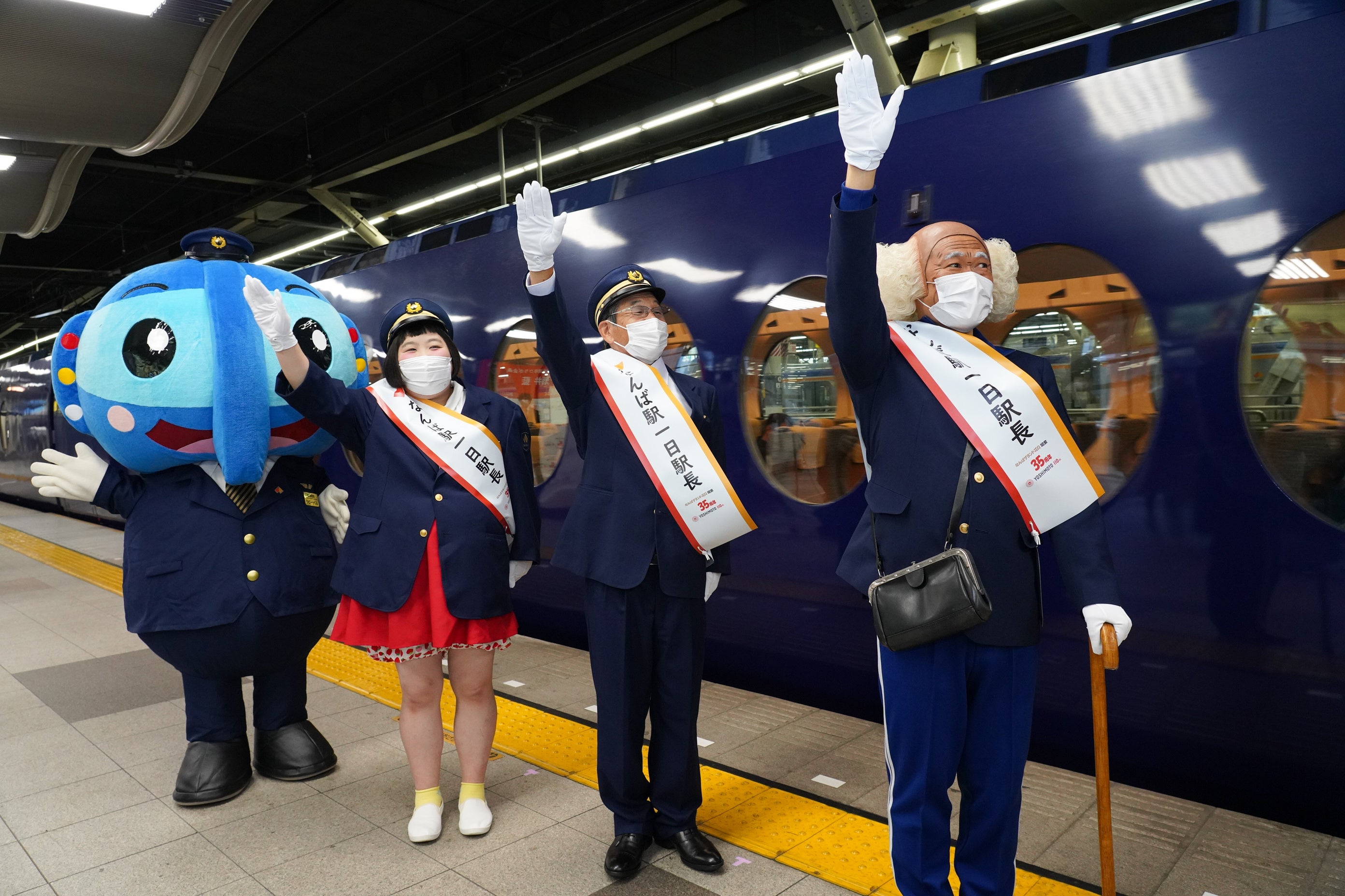 1日駅長に就任したのは吉本新喜劇の間寛平GM、辻本茂雄、酒井藍の3人。浅越ゴエの司会進行のもと、就任式が行われ、まずは3人からご挨拶がありました。