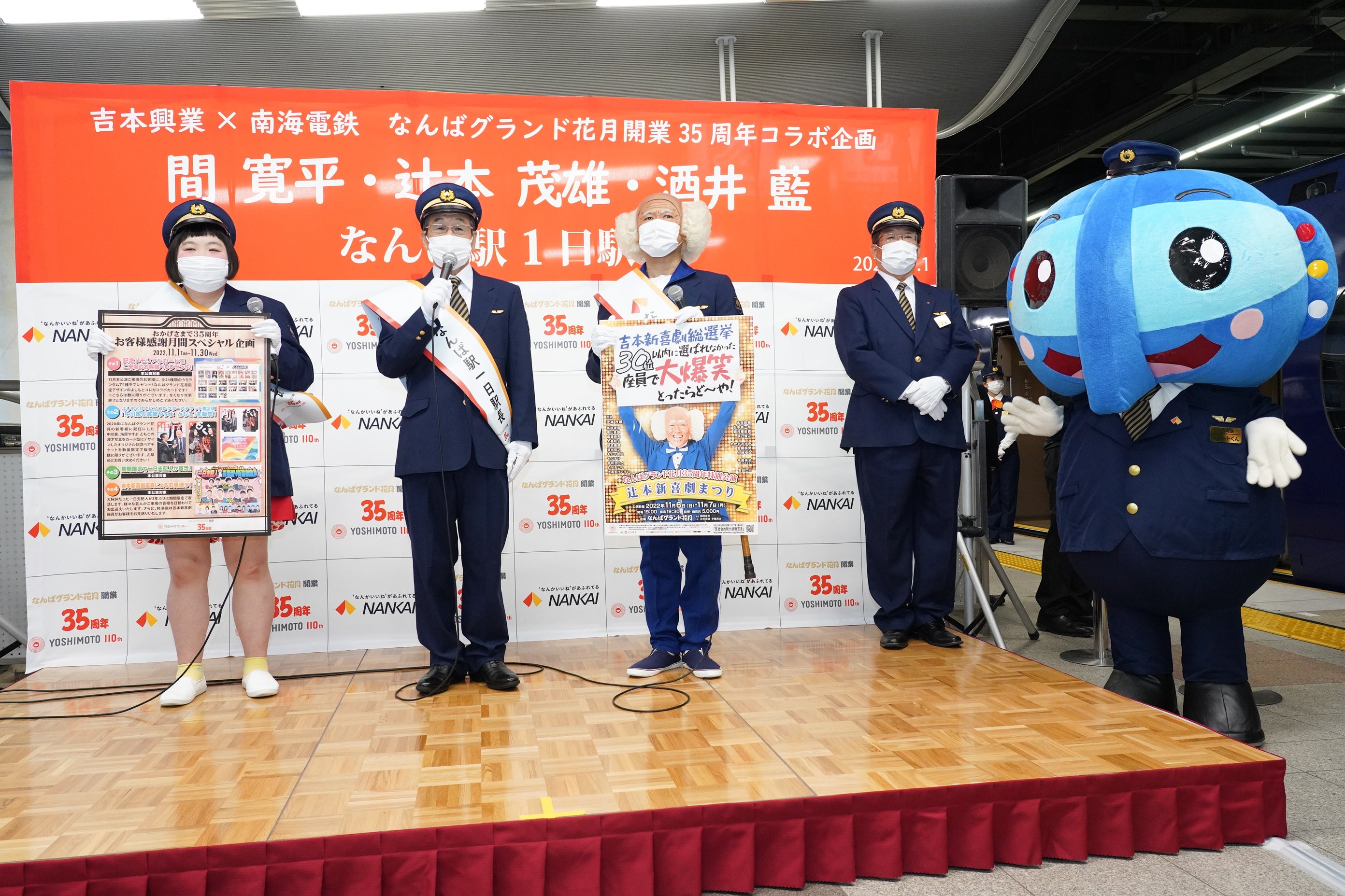 初日である1日(火)には、ご近所の企業と共に「これからも一緒に難波エリア全体を盛り上げていきましょう!」という趣旨のもと、「吉本興業×南海電鉄 なんばグランド花月開業35周年コラボ企画 1日駅長就任式」が南海電鉄難波駅で行われました。
