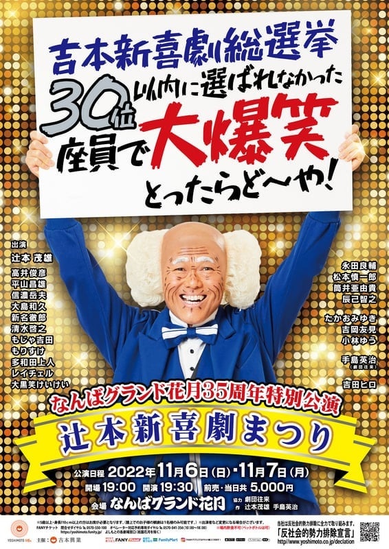 夜も35周年を記念した特別公演が目白押しです。そのうち、11月6日(日)・7日(月)にスペシャル新喜劇公演を行う辻本は、イベントの魅力を次のように話しました。「吉本新喜劇総選挙で30位以内に入らなかったけど、めちゃめちゃおもろい座員21人を厳選して2時間30分くらいのイベントをやります。面白いメンバーなので見に来てください!」。