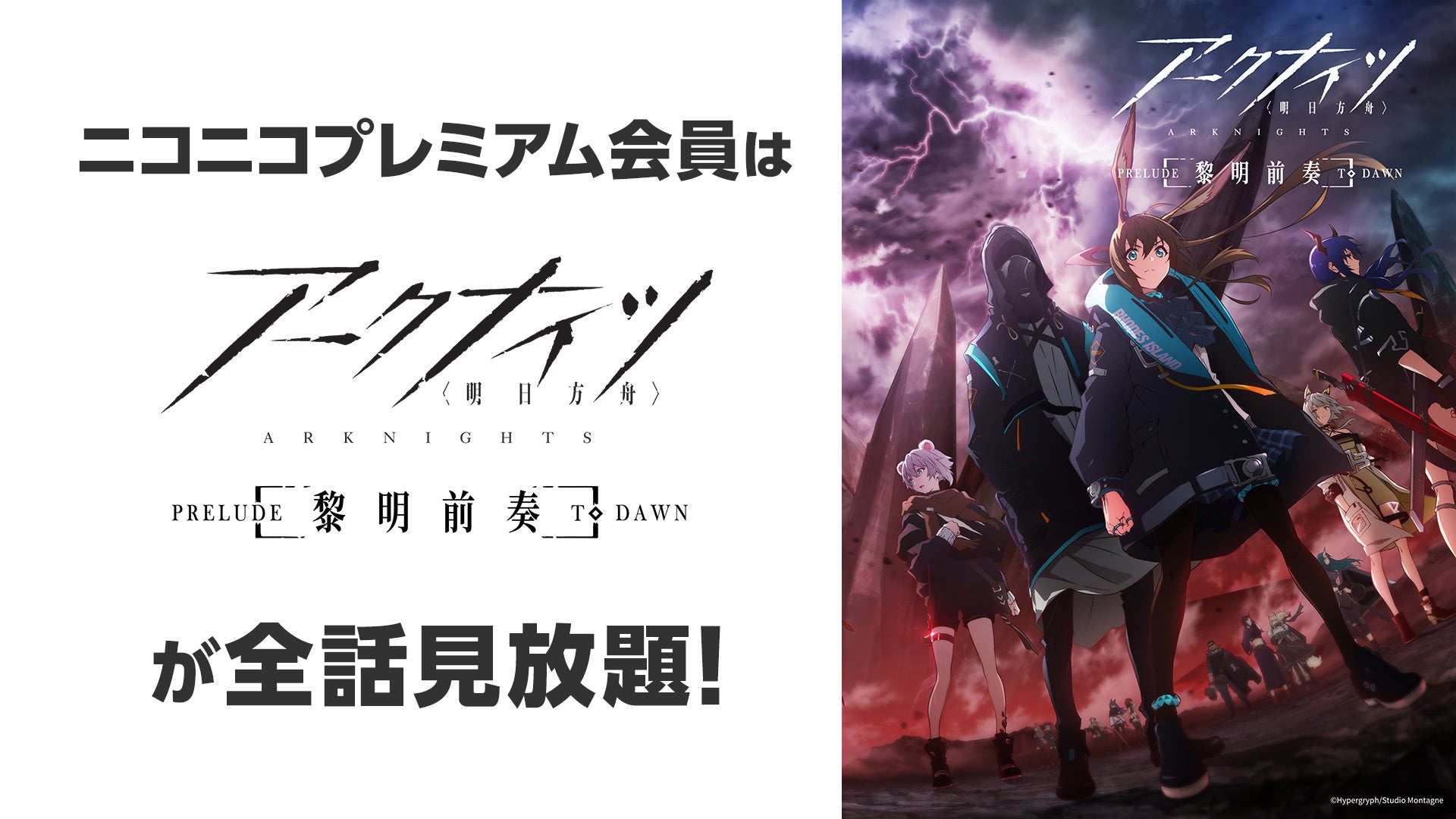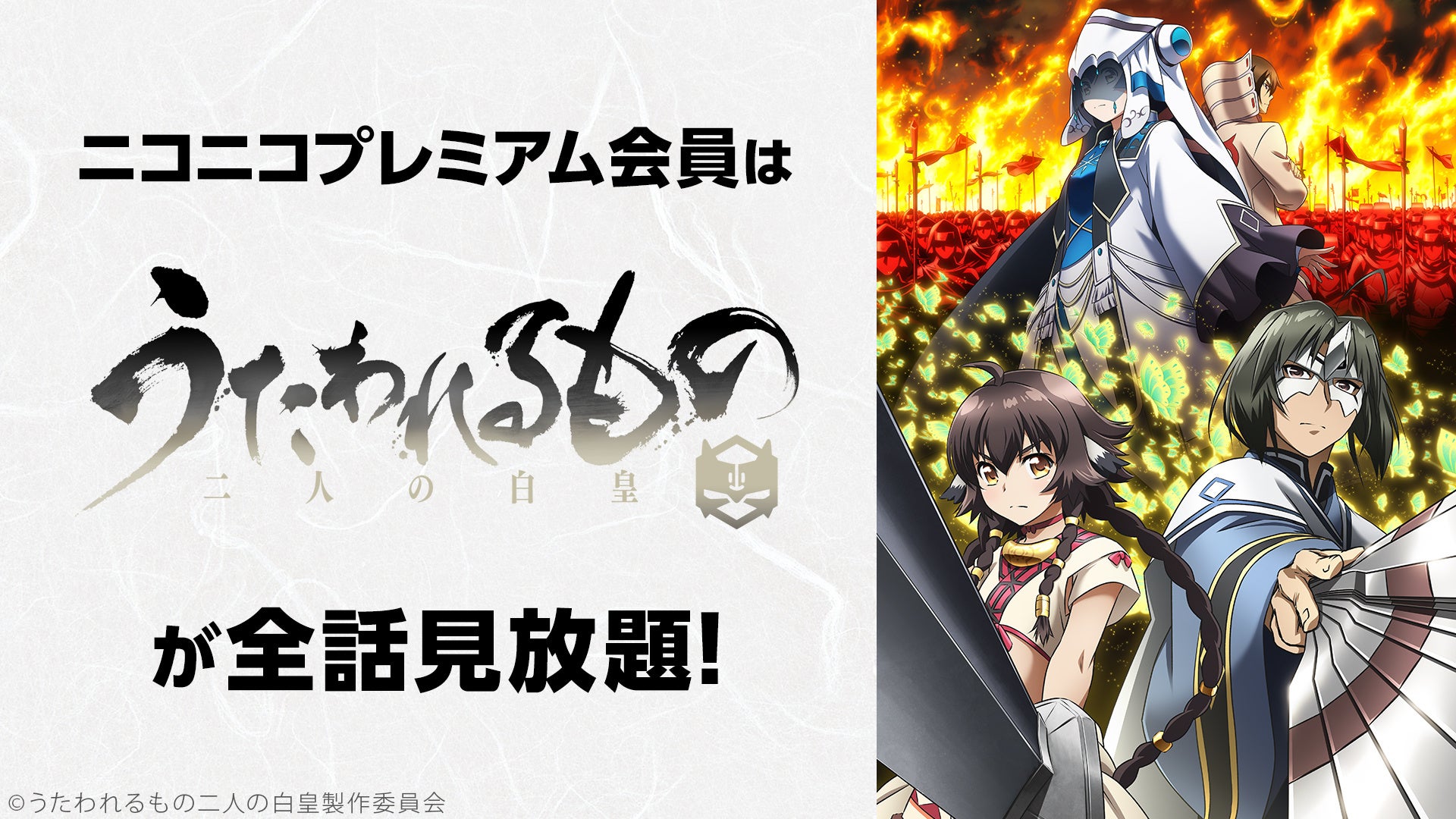 また10月から引き続き「5億年ボタン【公式】~菅原そうたのショートショート~ 」「ハナビちゃんは遅れがち」「うたわれるもの 二人の白皇」「宇崎ちゃんは遊びたい!ω」「4人はそれぞれウソをつく」「アキバ冥途戦争」「Do It Yourself -どぅーいっとゆあせるふ-」「アークナイツ【黎明前奏/PRELUDE TO DAWN】」「うまゆる」「映画 この素晴らしい世界に祝福を!紅伝説」「劇場版 艦これ」「ひぐらしのなく頃に卒」「私に天使が舞い降りた!」「ガールズ&パンツァー」「ガールズ&パンツァー これが本当のアンツィオ戦です!」「ガールズ&パンツァー 劇場版」のアニメ19作品と、「後宮の烏」のニコニコ生放送特番のニコニコプレミアム会員見放題を行います。