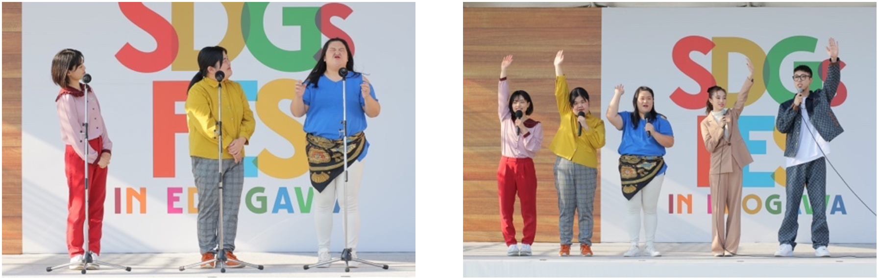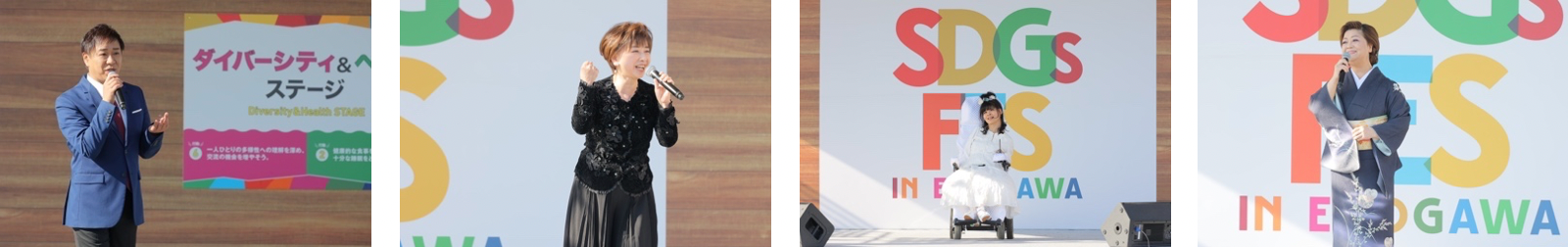 「ダイバーシティ&ヘルスステージ」では、優しく飾らない明るいキャラクターで、老若男女問わず幅広い層からの支持を受け、歌手、ラジオパーソナリティ、テレビ番組の司会などマルチに活躍する妻吹俊哉、重度身体障がいと言語障がいを抱えながらも、亡き母と約束した「NHK紅白歌合戦出場」を目指し、ライブ活動をはじめ、ファッションモデルやアパレルブランドのデザイナーなど精力的に活動する天羽柚月、そしてデビュー曲『おんなの出船』の大ヒットでNHK紅白歌合戦初出場を果たしてから、これまでに同番組に7度出場し、デビューから43年たった今も現役の演歌歌手松原のぶえらによる豪華ライブステージを展開。多様な出演者3名による、行動6を伝えるステージとなりました。さらに、心理カウンセラー、認知行動療法士、脳活性トレーナーなど、様々な資格を持つ女優大場久美子が登場。「「SDGsえどがわ10の行動エリア」内、6つのエリアを体験させていただいたのですが、心理カウンセラーとしては、人と人とのコミュニケーションをテーマに、【A:ダイバーシティエリア】に注目しました。皆さん色々な困りごとがあって、悩んでしまったり、つらいなと心に浮かぶことはありませんか?実は心は脳にあるんです。脳が色々なことを考えているんです。」と独自の視点と、女優ならではの演技を織り交ぜながら、SDGsや「心の健康」についてトークを展開。「続きはウェブで。」と笑いを誘いながらも、「人間1人では生きていけないですし、私も色々なことを助けていただきながら62歳になりました。とにかく皆さんどうぞ、どうぞ1人で悩まないでください。」とメッセージを送りました。