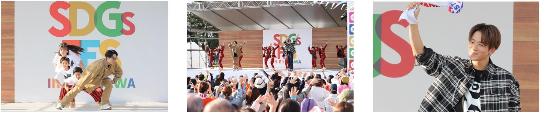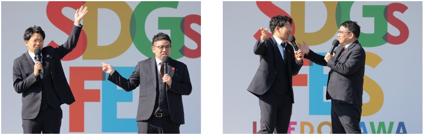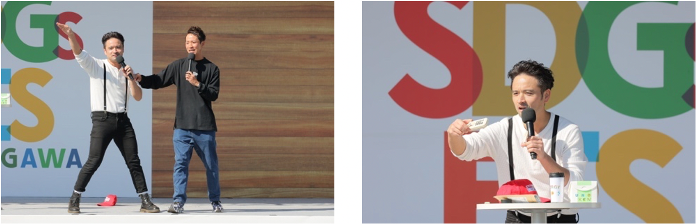 江戸川区のイイところ、面白い人物、楽しい催しなど、元気スポットを調査、体験する地域情報エンターテイメント番組『江戸川元気!パラダイス』のMCを10年務めているお笑い芸人げんき~ずによる配信限定スペシャルコンテンツを、江戸川区公式YouTubeチャンネルにて生配信!「SDGsえどがわ10の行動エリア」の体験やキッチンカーエリア、リサイクルステーションやフォトスポットを紹介する様子を生中継し、配信視聴者にもSDGsえどがわ10の行動やSDGs FESの魅力を存分にお届けしました!配信の最後にはスペシャルステージにも登場し、手を使わずに被っている帽子を飛ばすネタを披露。2人の最後まで“元気”なパワーに来場者も思わず笑顔に。「SDGsえどがわ10の行動エリア」を体験した感想もトークし、魅力を伝えました。