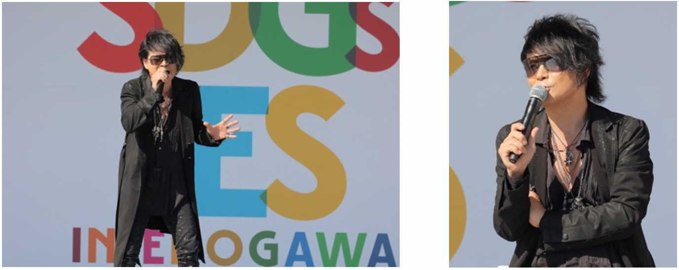 さらに、一世を風靡したロックバンドT-BOLANの森友嵐士が登場!大ヒット曲『離したくはない』、そして今年28年ぶりにリリースしたオリジナルアルバム「愛の爆弾=CHERISH ~アインシュタインからの伝言~」にも収録されている『My life is My way 2020』の2曲を歌唱。トークでは「僕は外に食べにいくことが多いので、注文をする際に量だったり、食べられないものを伝えて“残さない”ということを大切にしています。そして残飯には水分が含まれていて、焼却するのにすごいエネルギーがかかるので、ゴミに出さず、コンポストを使って有機肥料にして土に返す。循環させています。ちなみに10月は食品ロス月間、10/30は食品ロス削減デー、そして僕のバースデーも10/30ということで、ここに呼ばれたのも何かの縁なのかなと少しびっくりしています。」とコメントすると会場は拍手に包まれました。「江戸川区は区民一丸となってSDGsに取り組んでいるということに感銘を受けています。1人1人の心の中にある愛の発電機のスイッチをオンにして、僕たちの未来を、そしてこの地球と人間との関わりをより美しいものにしていきましょう。」と最後にメッセージを送りました。