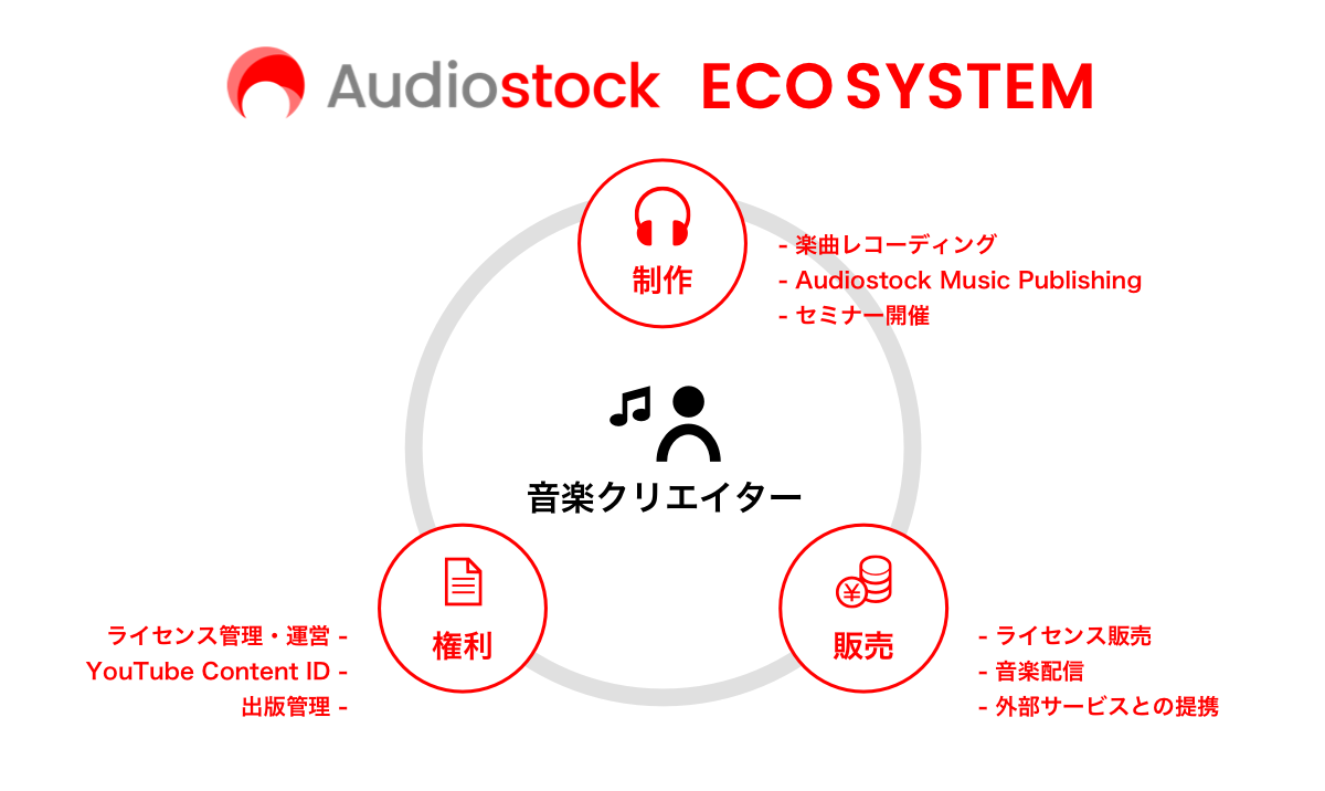 Audiostockは音楽の使用ライセンスを売買できるサービスです。音楽クリエイターは自身で制作した音楽を登録して使用権を販売することができ、売上に応じた印税を受け取ることができます。顧客は単品購入及びサブスクリプション方式で購入手続きを行うだけで音楽の利用許諾を得ることができ、映像・ゲーム・アプリ等の商用コンテンツに音楽を組み込むことができます。