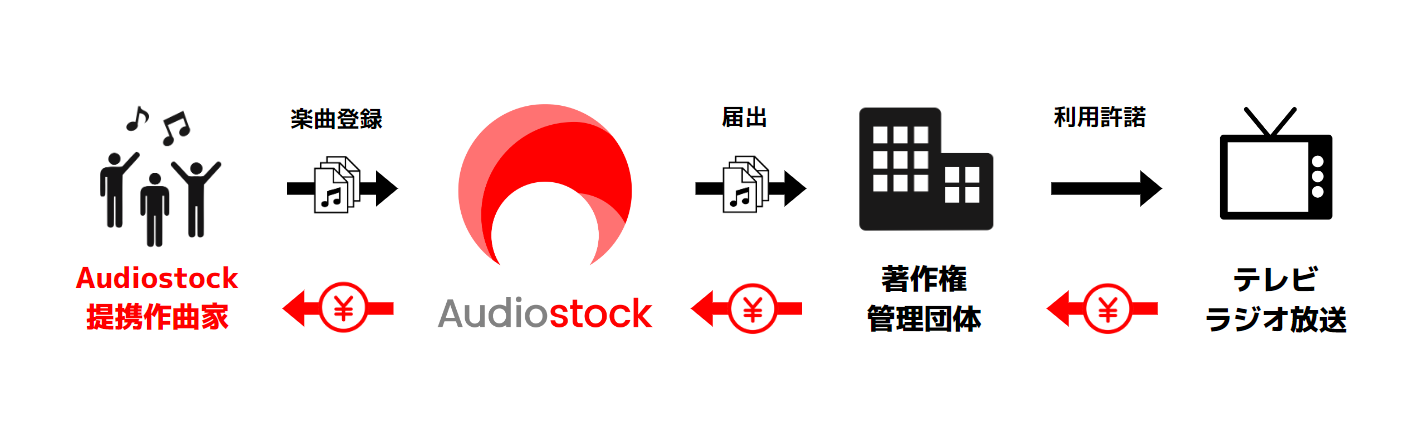 「Audiostock Music Publishing」では、Audiostockで活躍中の一部の音楽クリエイター「Audiostock提携作曲家」の作品を当社が預かり、著作権管理団体へ届出を行うことで、作品がテレビ・ラジオ放送で利用された際に印税分配を行います。(※1)