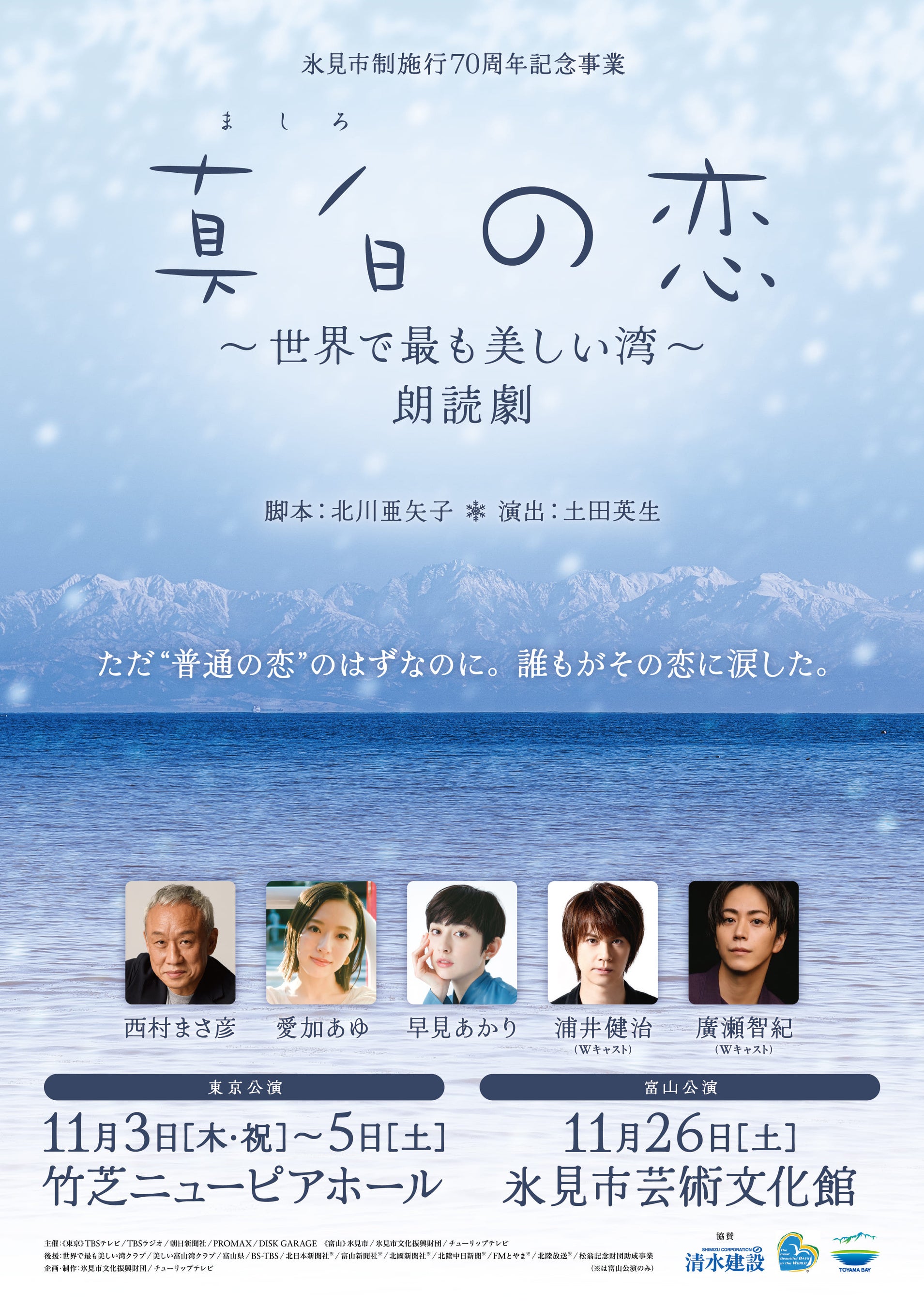 本作は、2017年に富山県射水市(新湊)を舞台に、軽度の知的障がいのある主人公・真白(ましろ)の初恋を描いた映画を原案に朗読劇化。様々な問題に直面しながらも前向きに人生を歩んでゆく人々の姿を描きつつ、富山の魅力も伝える珠玉の感動作です。朗読劇の脚本は、映画でも原作・脚本を務めた北川亜矢子がふたたび担当し、土田英生が演出を担当。主人公・真白 役には初めての朗読劇となる早見あかりが主演し、真白にとって初恋の相手となる・油井景一 役には浦井健治と廣瀬智紀によるダブルキャスト、さらには愛加あゆ、西村まさ彦、と豪華出演陣を迎えてお届けします。