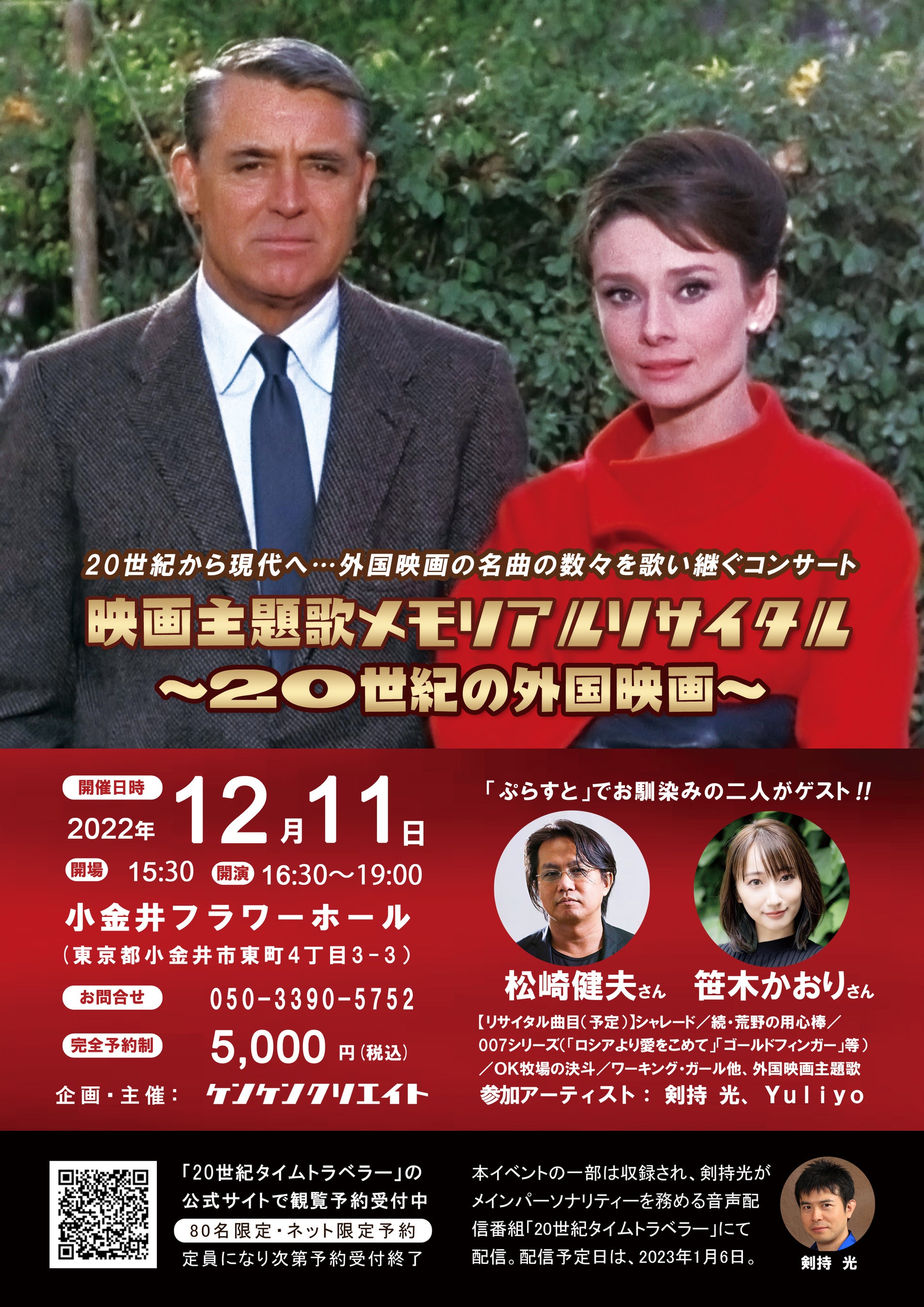 映画評論家・松崎健夫さんとタレントの笹木かおりさんをゲストに迎え、音声配信番組「20世紀タイムトラベラー」の公開収録(約1時間)。メインパーソナリティーは、剣持光。