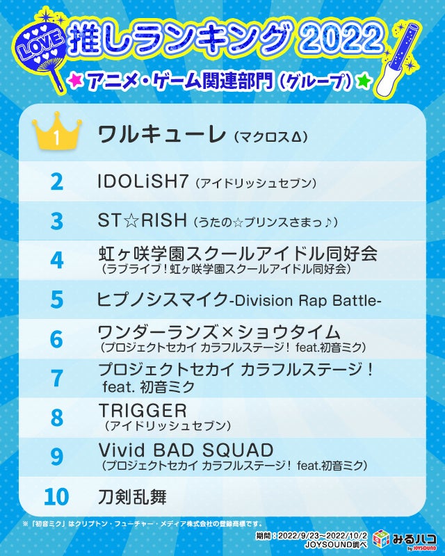 ・「推しランキング2022」 JOYSOUNDユーザーに今もっとも推されているアーティスト、キャラクターは!?