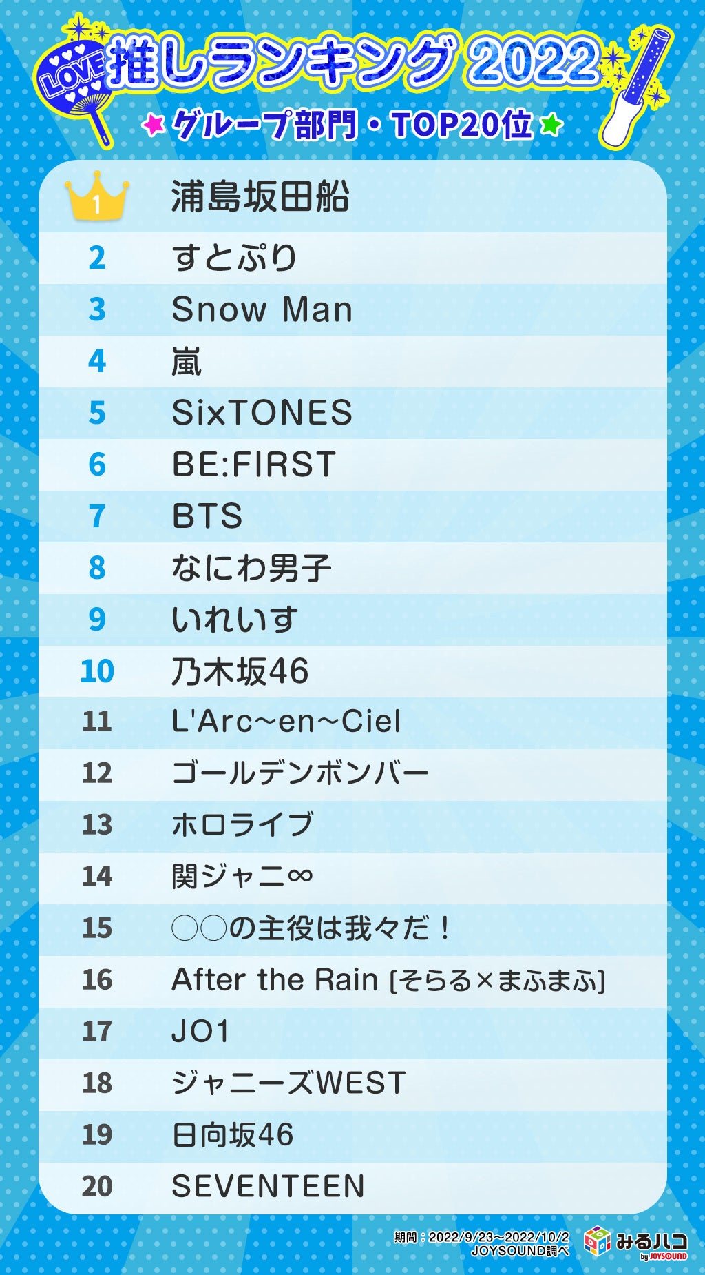 楽曲の魅力はもちろん、メンバー同士の仲の良さや男子校感満載のわちゃわちゃ感も好感を呼び、10~20代の女性の圧倒的な支持を獲得している「浦島坂田船」がトップに。なお、TOP3は昨年から不動で、ネットを中心に活動する人気エンタメユニット「すとぷり」が2位、快進撃を続ける人気アイドルグループ「Snow Man」が3位を獲得しました。