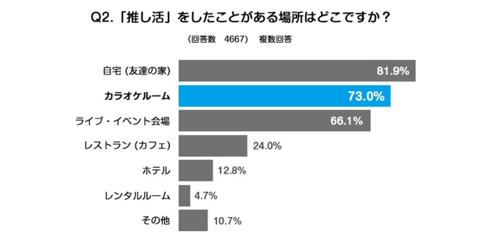 実際、推し活をする場所として「自宅(81.9%)」に続く2位に「カラオケルーム(73.0%)」がランクイン。ライブ・イベント会場よりも手軽な推し活の場として「カラオケ」が利用されています。