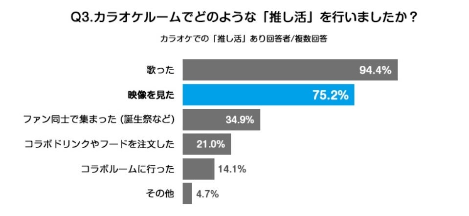 また、カラオケにおける「推し活」は、「歌う」(94.4%)に次いで、「映像を観る」が75.2%を占める結果に。