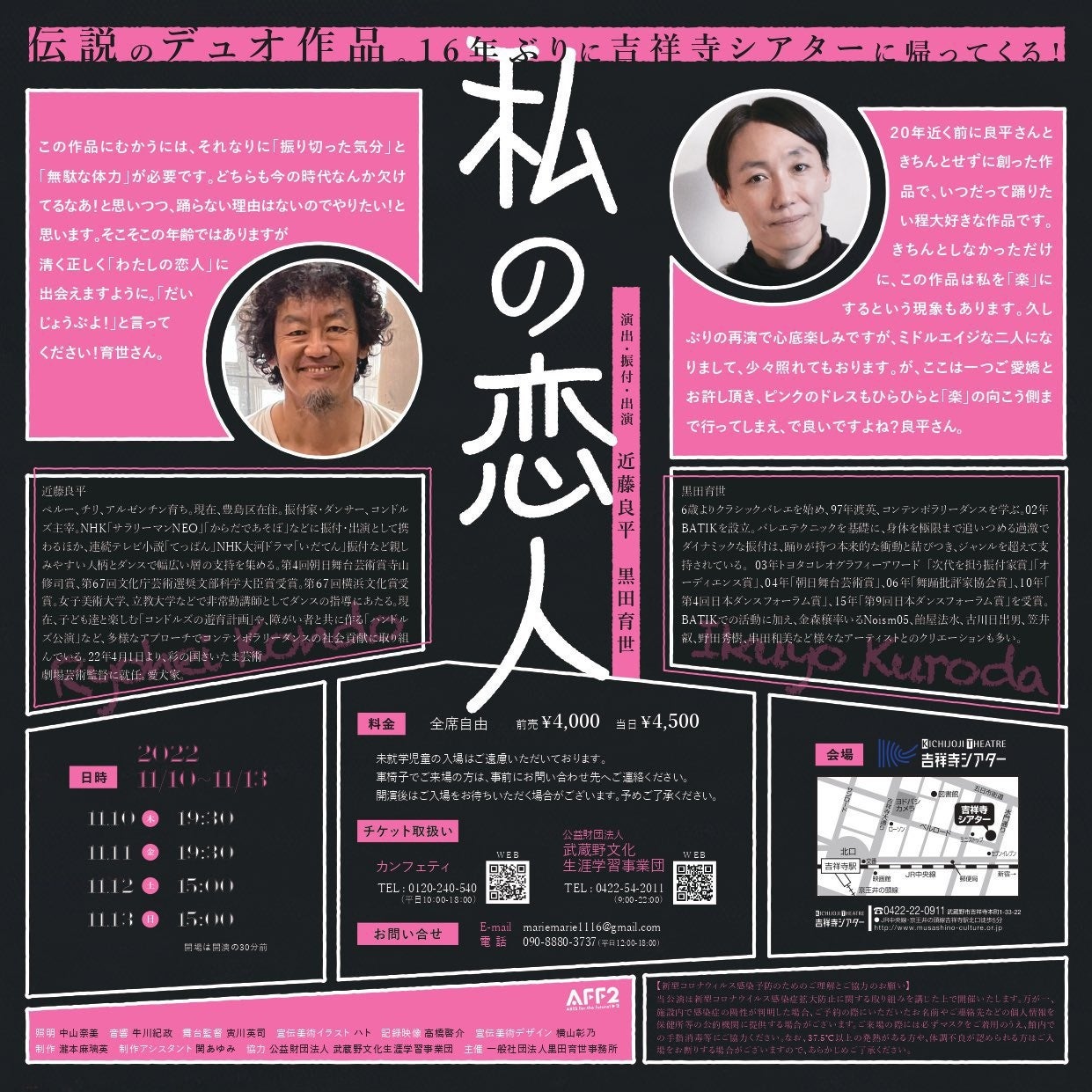 一般社団法人黒田育世事務所主催、近藤良平・黒田育世デュオ作品『私の恋人』が2022年11月10日 (木) ~2022年11月13日 (日)に吉祥寺シアター(東京都武蔵野市吉祥寺本町1丁目33番22号)にて上演されます。