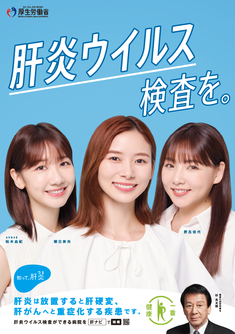 また、新ポスターにはAKB48の柏木由紀氏、7月から新スペシャルサポーターに就任した朝日奈央氏、野呂佳代氏が出演しました。完成したポスターについて柏木氏は「シンプルでありながらも、肝炎ウイルス検査を受けてほしいという強いメッセージがダイレクトに伝わるポスターに仕上がりました。是非、沢山の方にこのポスターを見ていただきたいです!」と力強く呼びかけました。
