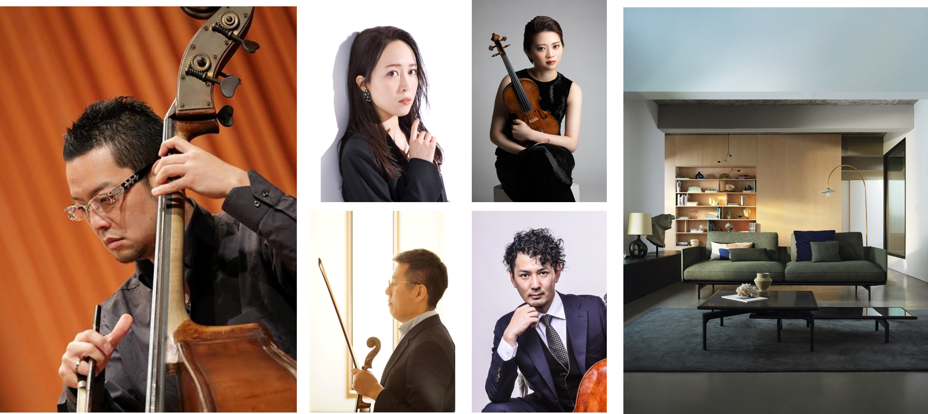 この度のスペシャルコンサートでは、ドイツのクラフトマンシップが息づく高いクオリティ、そして類稀な掛け心地で高い評価を得るドイツを代表するブランド「ロルフベンツ」の家具で寛ぎながら、クラシック音楽の文化を築いたドイツで誕生した名曲の数々をお楽しみいただけます。演奏には、世界中で活躍するドイツ出身のコントラバス奏者 鷲見精一氏率いる、弦楽奏者5名が登場し、コントラバス・ヴァイオリン・ヴィオラ・チェロの四重奏で一夜限りの美しい旋律を奏でます。