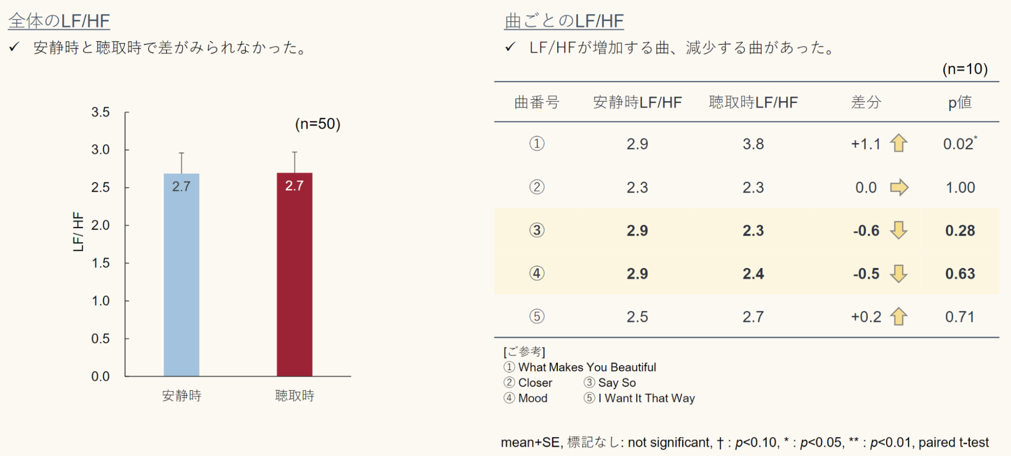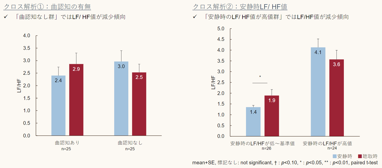 被験者の曲認知の有無別の結果では、認知がある曲を聞いた際は、LF/HF値(自律神経機能のバランスを表す指標であり、低値だと副交感神経優位、高値だと交感神経優位である)が上昇しているのに対し、認知がない曲を聞いた際はLF/HF値が減少していました。このことから認知のない曲を聞くと副交感神経が亢進される可能性が示唆されました。