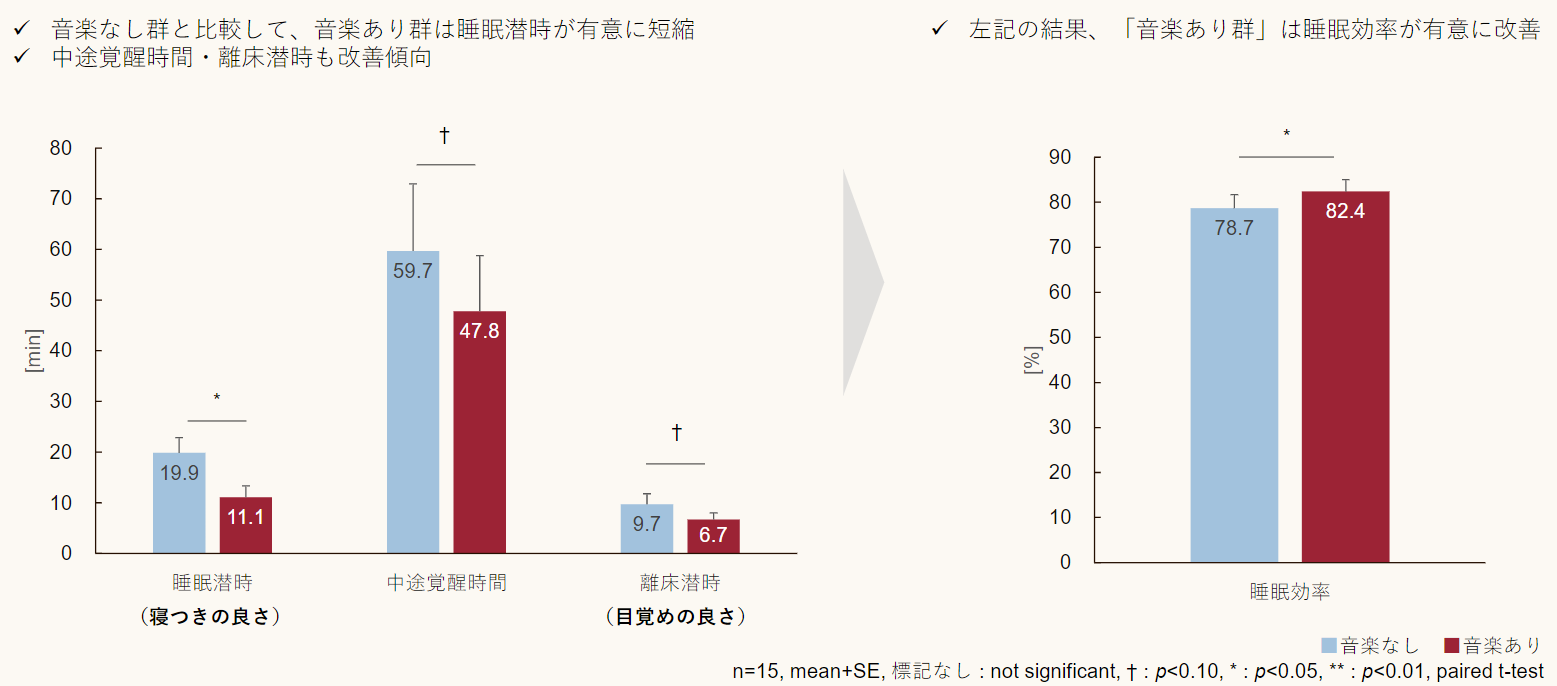 音楽なし群と比較して音楽あり群は睡眠潜時が有意に短縮し、睡眠効率も有意に改善することが確認されました。以上のことから、《sasayaki lullaby》の聴取により、睡眠潜時・睡眠効率が改善する可能性が示唆されました。