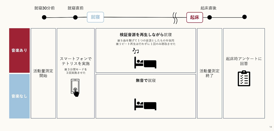 睡眠状態の評価は、客観的指標として活動量計による測定、主観的指標としてVAS法を用いたアンケートを実施しました。本検証により、《sasayaki lullaby》の聴取が睡眠にどのような影響を及ぼすかを検証しました。