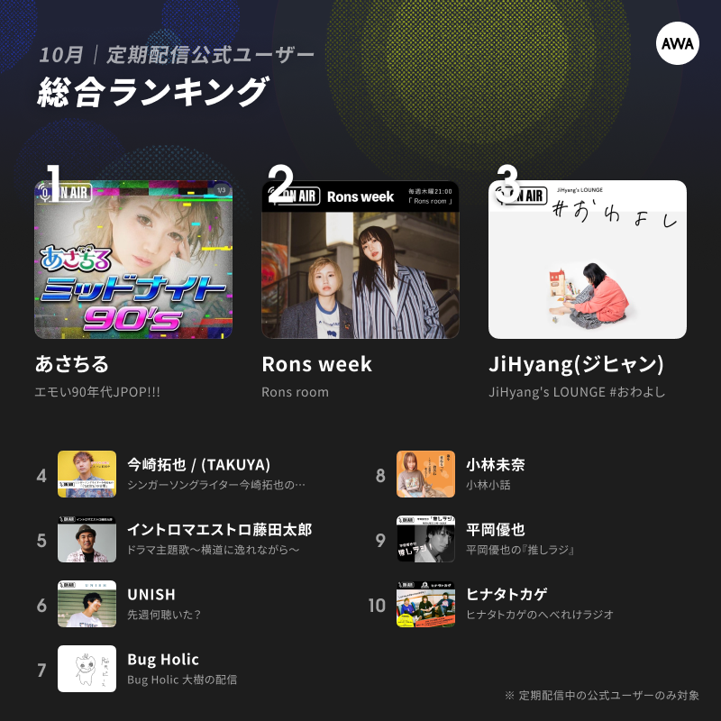AWA株式会社(本社:東京都港区、代表取締役CEO:冨樫晃己)が運営する、サブスクリプション型(定額制)音楽ストリーミングサービス「AWA(アワ)」は、2022年10月1日(土)から10月31日(月)までに開催された、音声ライブ配信を利用した「ラジオ配信ラウンジ」※の視聴数、開催頻度、リアクション数などを総合して、2022年10月の人気ラジオ配信ラウンジランキングTOP10を発表いたしました。