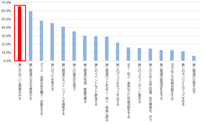 推している存在がいる。かつ、推し活をしている方の内、全体の6割以上は「推しの映像をみる」推し活をしているという結果になりました。推しを応援するのと同時に、推しの映像をみることでご自身を癒している方が多いことが推察されます。その他では、「情報収集」「グッズ収集」の傾向があり、推しに関する理解・把握、新しいものを収集する活動をされていることが判明しました。