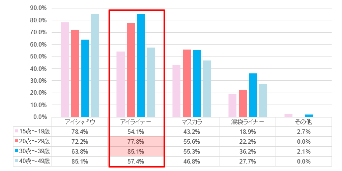 「推し活メイク」のアイメイク方法としてアイシャドウ・アイライナーを取り入れる方が、最も多い結果となりました。年代別で見ると、20・30代は「アイライナー」の回答者がアイシャドウに比べ多い結果となり年代別での傾向差が出ました。