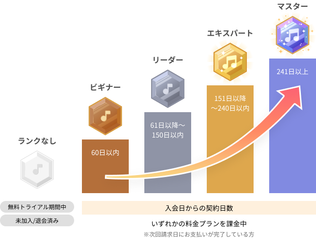 (注1)トライアル期間中は対象外となります。無料トライアル期間終了後の次回請求日に支払いが確定した時点で、ランクが確定します。年間プランを契約している場合は、無料トライアル期間が終了次第、ランクが確定します。