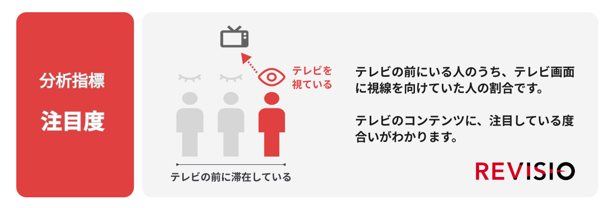 テレビの前にいる人(滞在者)のうち、テレビ画面に視線を向けていた人(注視者)の割合を表します。シーンに注目している度合いがわかります。
