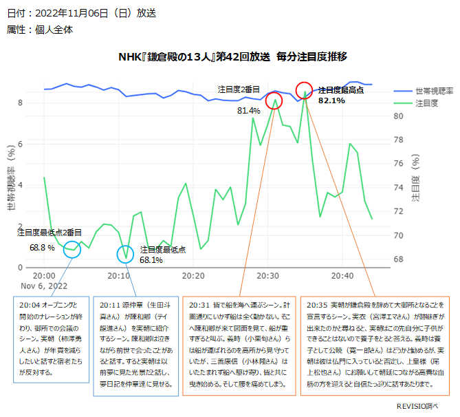 2022年1月にスタートした、三谷幸喜さん脚本・小栗旬さん主演の『鎌倉殿の13人』を、毎放送回、視聴者がどのシーンに注目したのかを分析しています。11月6日に放送された第42回は、視聴者にどのように見られていたのでしょうか?