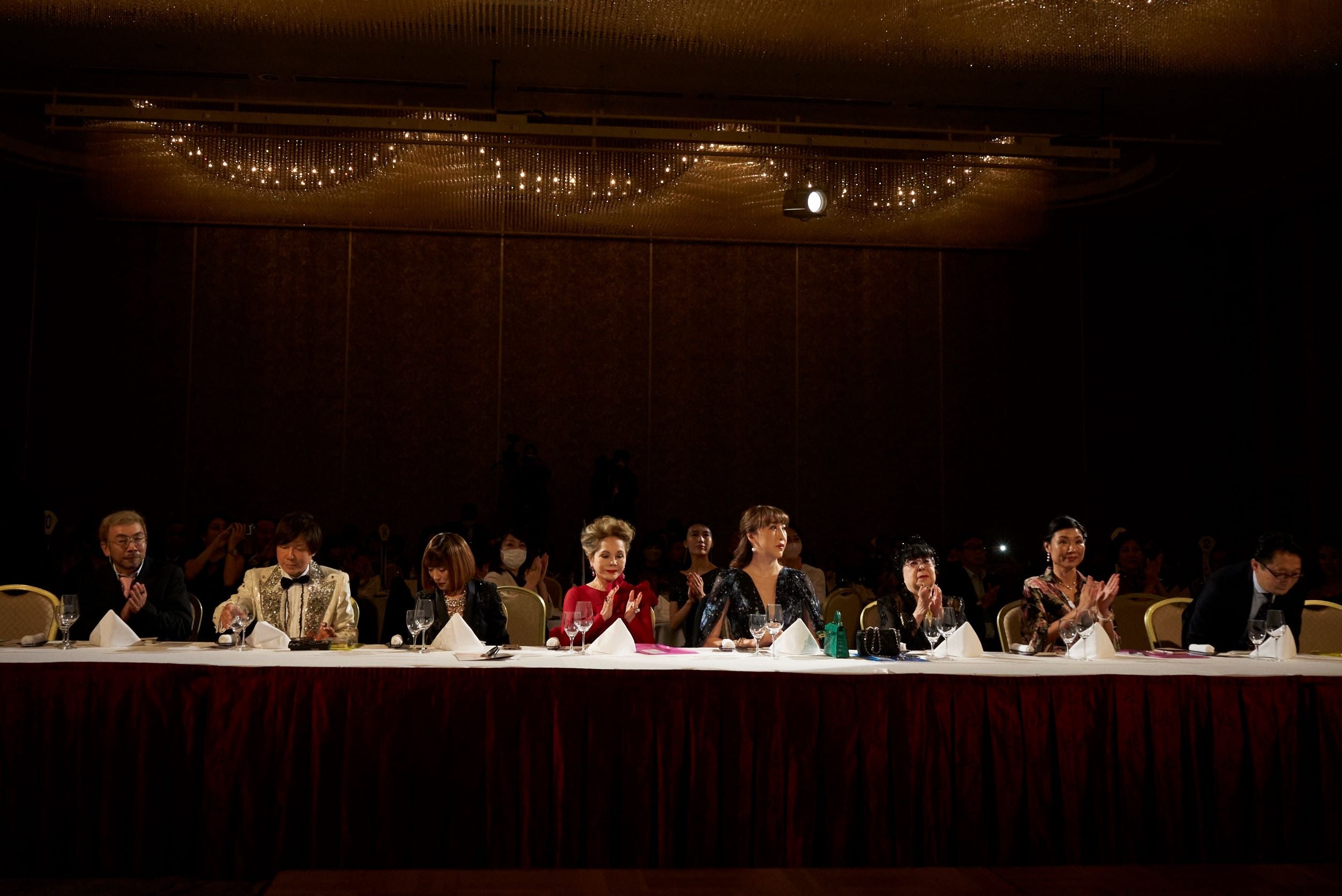 入賞者の豪華審査員との記念撮影(左から村上麻衣、上野和孝、永井松美、MImimika田中、藤野真紀子、デヴィスカルノ、桂由美、優勝者野口祐子、戸田さとみ、関谷詩織、秋田陽子、桜宗佐、龍信之助、竹林真登香)