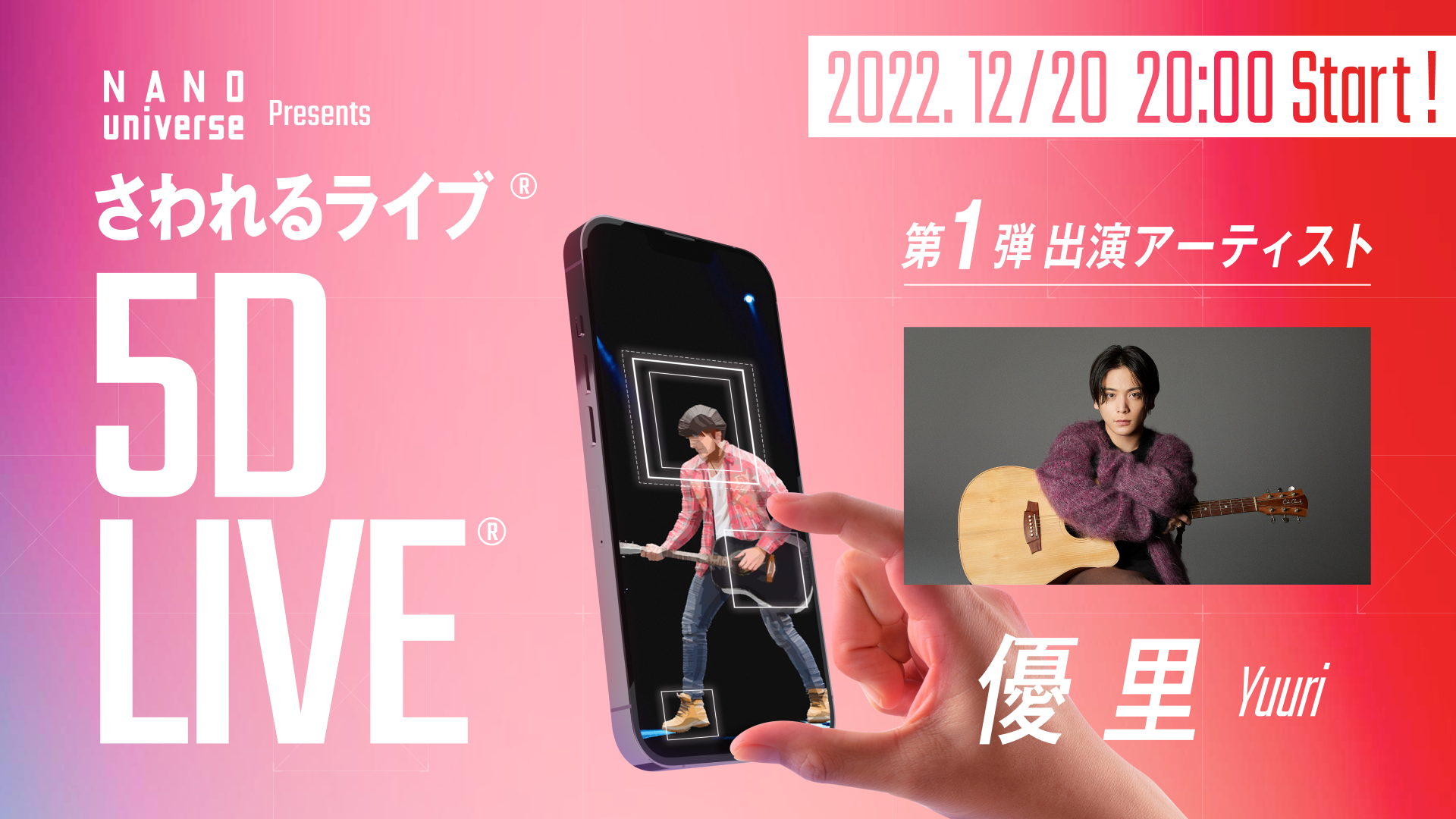 ■ イベント名 : 「NANO universe Presents 5D LIVE® × 優里 Xmasワンマンライブ」 ■ 出演アーティスト : 優里 ■ 視聴方法 : 5D LIVE専用アプリ(iOS, Android)にて視聴(12月リリース予定) ■ 開催日時 : 2022年12月20日(火)20:00開演 ■ 見逃し配信 : 当日配信終了後〜2022年12月21日(水)23:59まで ■ 公式サイト : https://5dlive.birdman.tokyo/yuuri/ ■ チケット販売サイト : 公式サイト、チケットぴあにて販売 ■ 企画・提供 : Birdman / 太陽企画 ■ 協賛 : NANO universe |