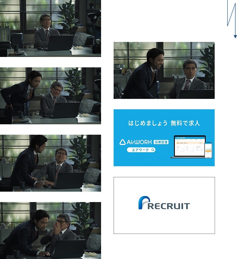 今回は、応募が来ないのでは? と、怖くて『Airワーク』の求人をチェックできない松本社長が、画面を開いて山田さんと喜び合うまでの表情の変化が見どころです。そんな松本社長を「大丈夫ですよ」と励ますすっかり頼もしくなった山田さんに、二人の関係が深まっているのが感じられますが、ハイタッチはすれ違ってしまうという、ちょっととぼけたところがほほ笑ましいCMに仕上がりました。