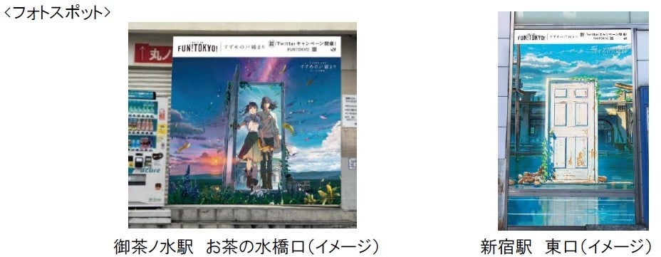 | 〇JR東日本首都圏本部が運営する、「FUN!TOKYO!」と11月11日(金)公開の映画『すずめの戸締まり』がタイアップした特別企画を開催します。 〇新宿駅と映画に登場する御茶ノ水駅を「FUN!TOKYO! すずめの戸締まり」フォトスポットの特別装飾で彩ります。 〇「FUN!TOKYO!」のTwitterでは抽選で映画『すずめの戸締まり』オリジナルグッズなどが当たるプレゼントキャンペーンを実施します。 |