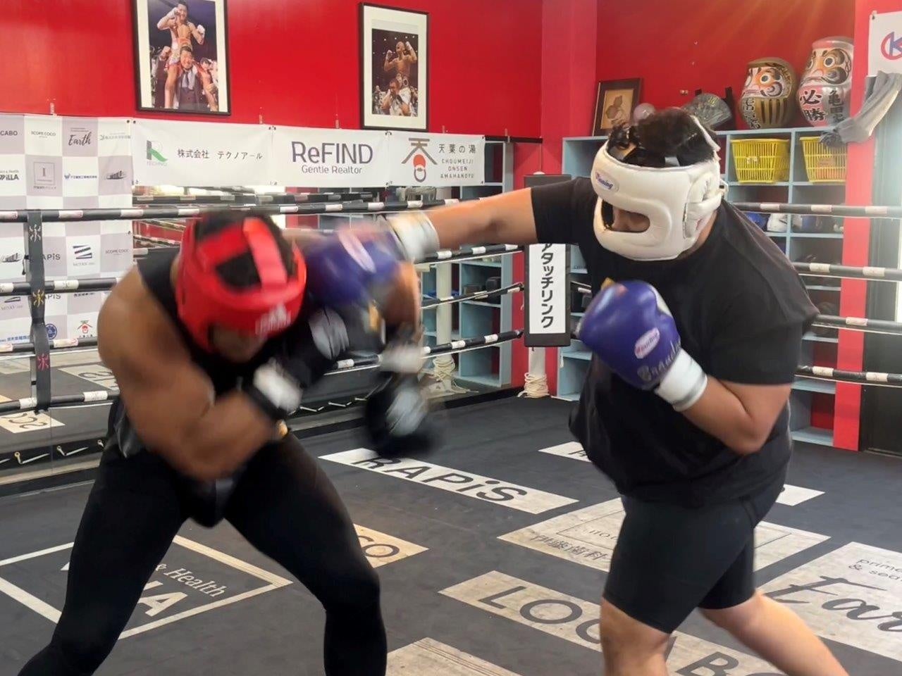 この日の会見後には、オーストラリアから招聘したパートナーとのスパーリングも公開した但馬。ヘビー級同士の迫力あるパンチの応酬が繰り広げられ、白熱のスパーリングが展開された。今後は試合に向けた調整が急ピッチで進められていく。