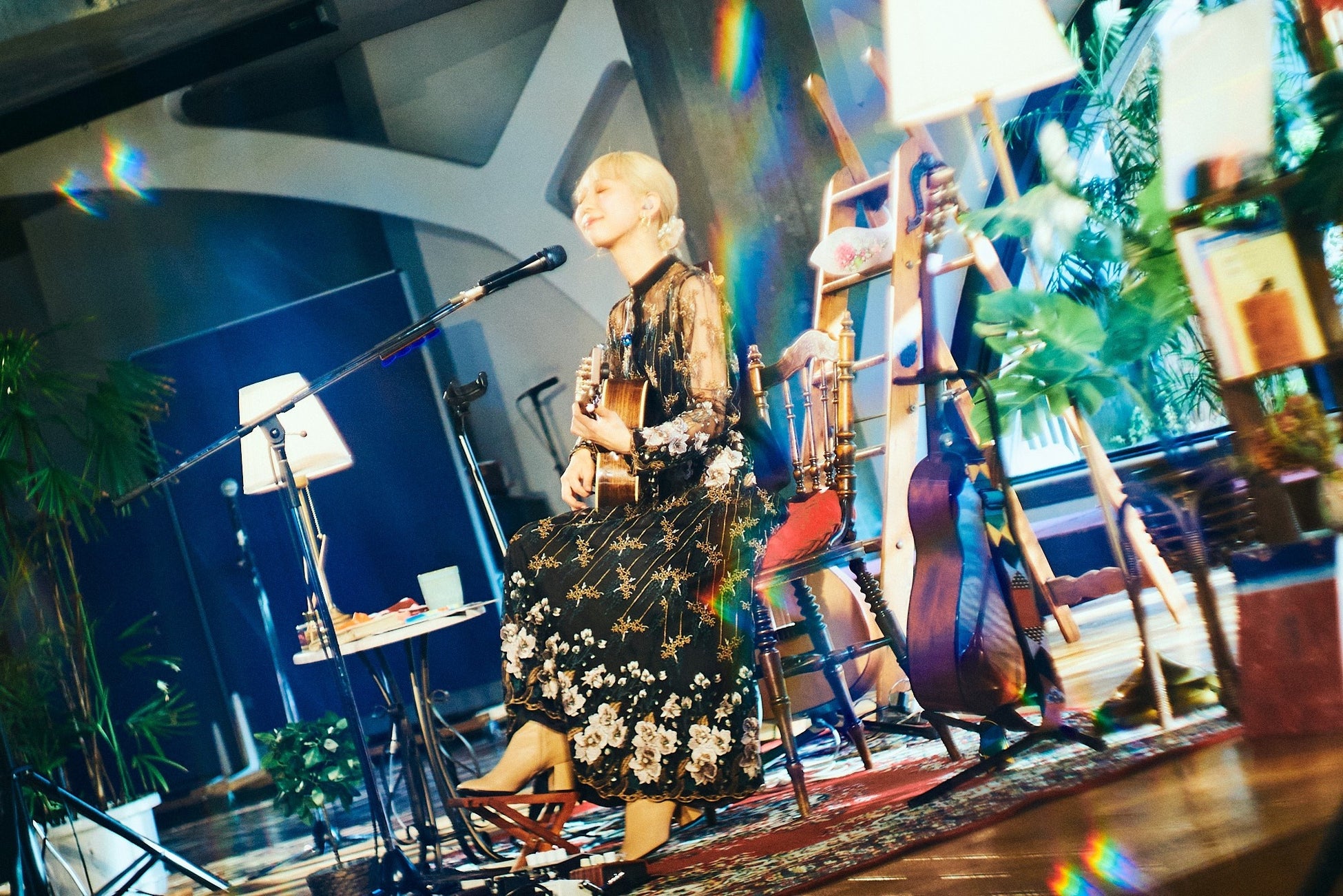 「私の部屋に遊びに来た感じで楽しんでもらえたら」というのも、「atELIER -アトリエ-」ツアーのテーマ。「Rhythm Nation」(ジャネット・ジャクソン)、「踊(Odo)」(Ado)のカバーでは、“普段もこんなふうにいろんな曲を弾き語りしてるんだろうな”と思わせる遊び心たっぷりの演奏を披露。ステージに置かれたランプ、テーブル、観葉植物などもこのライブの親密なムードにつながっていた。