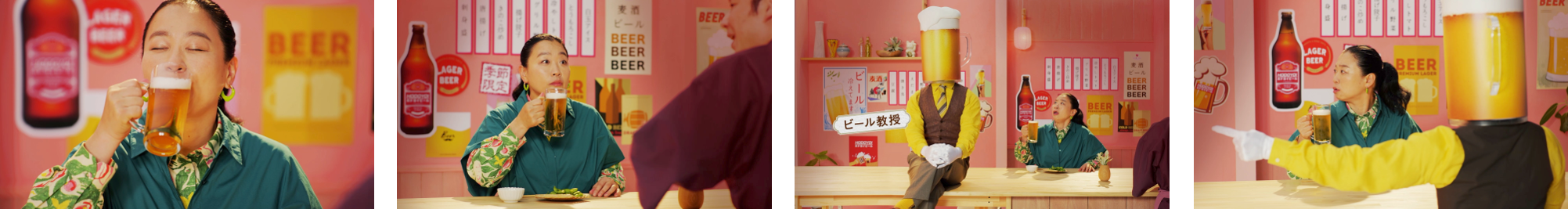 撮影前の打合せで本動画のほど酔いテクニックの説明を受けて「え!本当にビールメーカーの社員さんが普段されていることなんですね」と驚かれたいとうさん。リズミカルな音楽にのって動くシーンでは、何度もテイクを重ねて出演者全員の動きを合わせていきます。いとうさんにも腕や首の角度までこだわっていただき、一体感のある撮影となりました。そんないとうさんの表情が一際活き活きとしたのが、ビールを味わうシーン。言葉がなくても表情だけでおいしさが伝わってくるような、お酒好きのいとうさんの魅力あふれる一場面です。