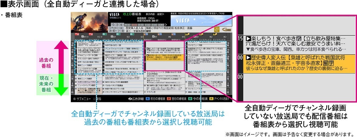 また、指定したチャンネルを全て自動録画・消去するパナソニックのブルーレイレコーダー「全自動ディーガ」など、対応のディーガ(※1)との組み合わせにより、ビエラの番組表に新たに過去に遡った番組表を表示する「過去未来番組表」と連携して使用することができ、よりシームレスに番組を視聴することも可能です。