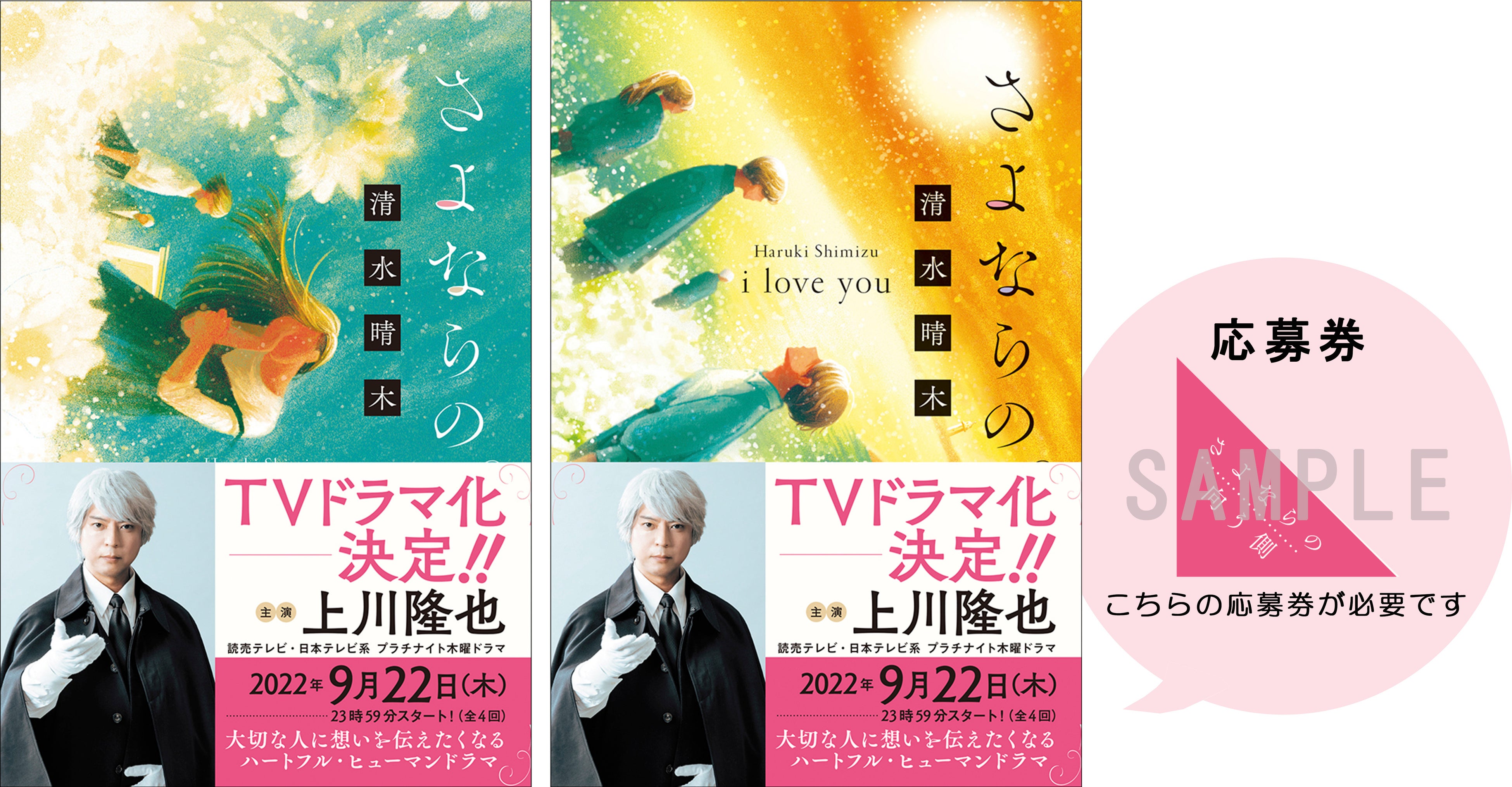 TVドラマで案内人を演じる上川隆也さんのキービジュアルが印刷されたドラマ帯の『さよならの向う側』『さよならの向う側 i love you』をお買い上げいただき、帯についている応募券をハガキに貼ってご応募いただいた方の中から抽選で50名様に「オリジナルQUOカード」(500円分)をプレゼントいたします。