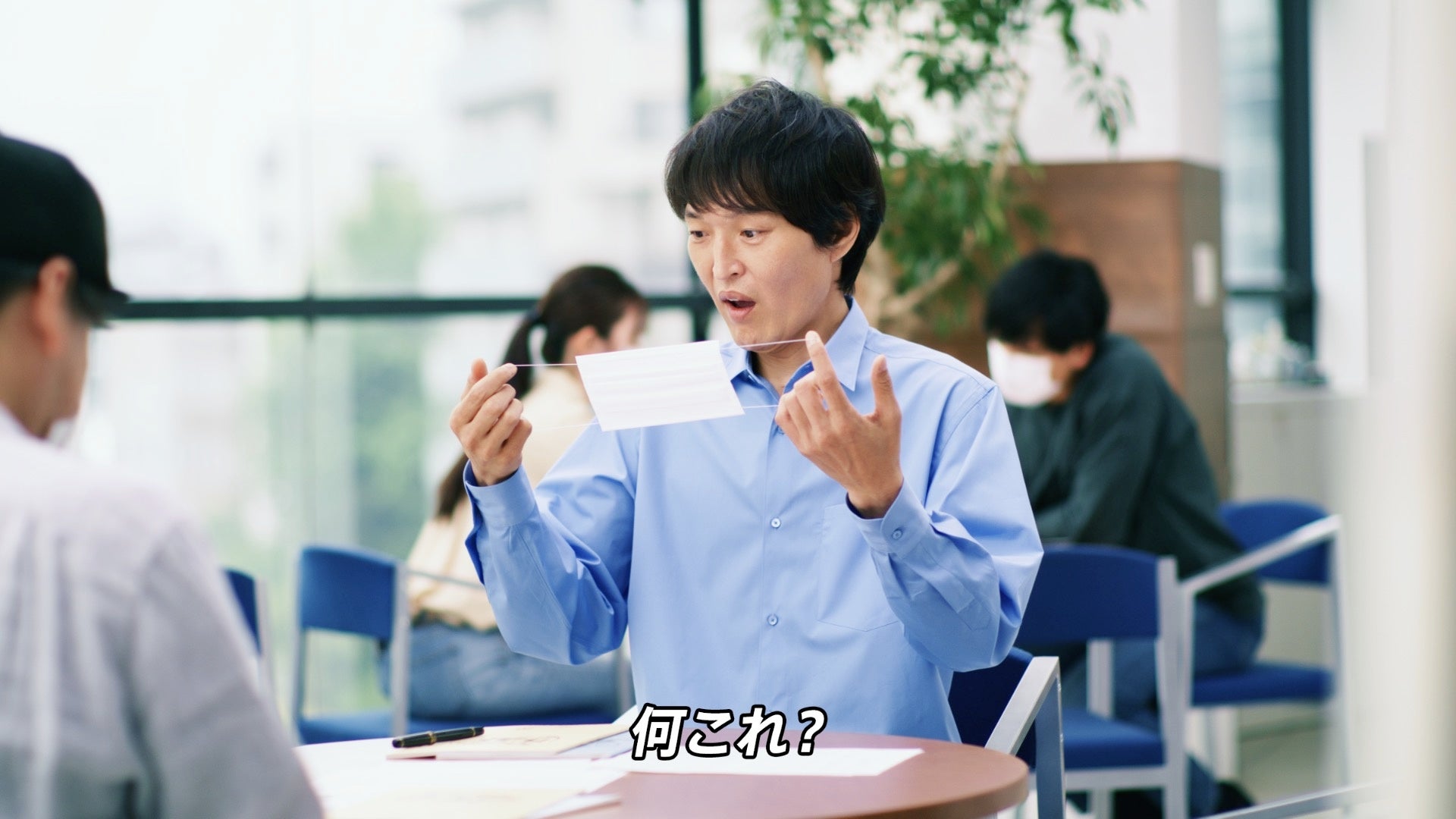 テレビ局の打ち合わせスペースで、打ち合わせの合間にスタッフと話をしている千原ジュニアさん。スタッフから「ふわるんNマスク」を渡された千原ジュニアさんは、「何これ?」と興味津々の様子を見せます。手に取ったマスクの耳ゴムを引っ張った千原ジュニアさんは、体温で伸びる不思議な耳ゴムにびっくり。驚きの表情を浮かべます。さらにそのゴムを耳にかけた千原ジュニアさんは、驚きのあまり思わず大きく目を見開いて立ち上がると、「メチャメチャええ~」と叫び、「着けてる気ぃせえへん!」と恍惚の表情を見せます。終わりには、「試したら感動やで!」と笑顔を見せ、「ふわるんNマスク」のつけ心地の良さをアピールしています。