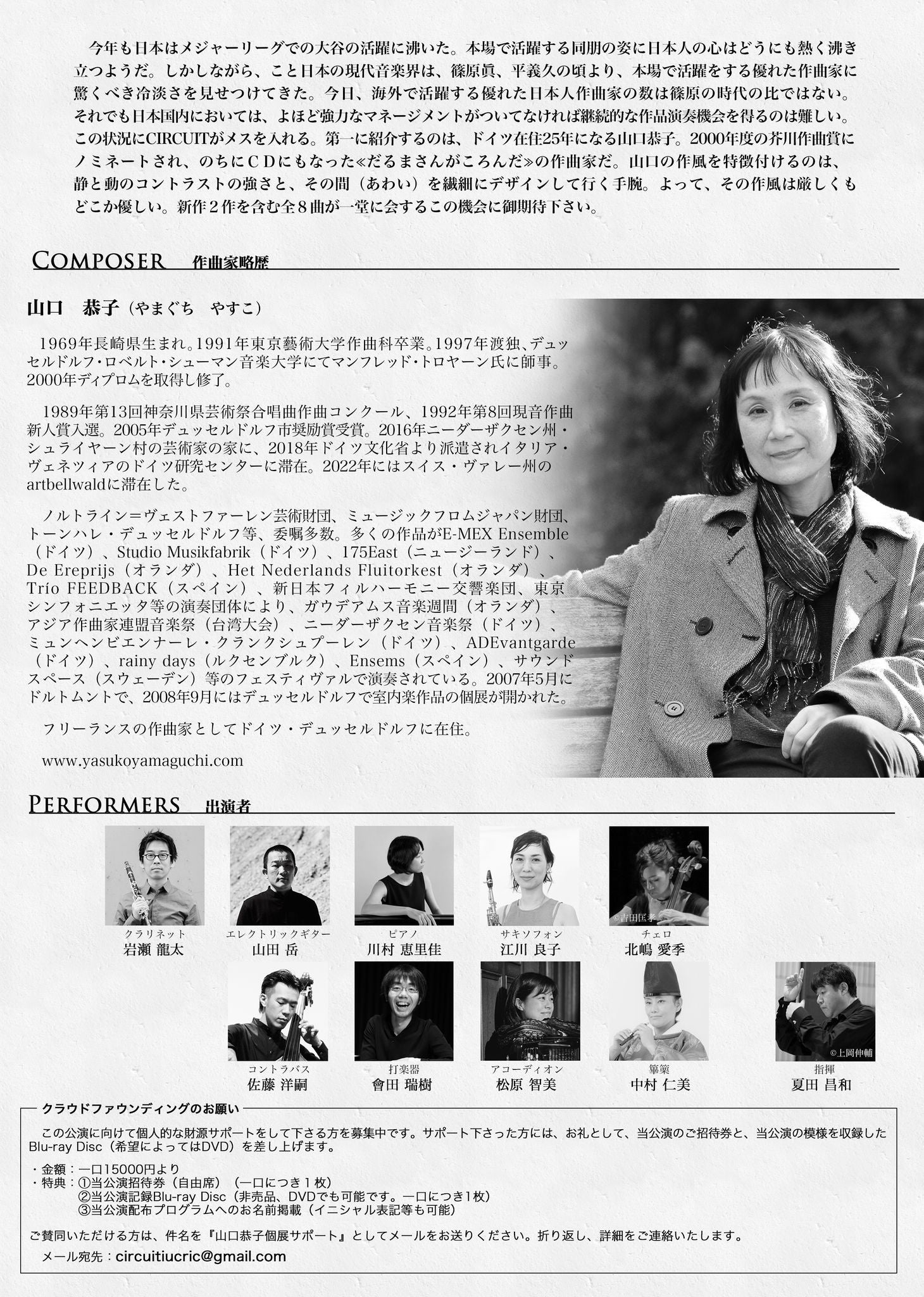 ドイツ在住25年になる山口恭子は、2000年度の芥川作曲賞にノミネートされ、のちにCDにもなった《だるまさんがころんだ》の作曲家であるが、それ以降日本では細々とは演奏されているものの、まとまった仕事を振り返る場がないまま今日まで来てしまった。この辺で彼女の活動を日本の観客とともに振り返る機会を設けようということで、この企画がスタートした。新作2作を含む全8曲が一堂に会するこの機会をお見逃しなく。ご来場をお待ちしています。