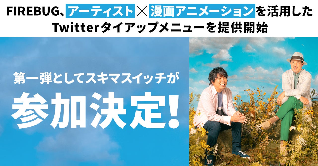 タレントエンパワーメントパートナーとして多様なコンテンツを中心にマーケティングソリューションを提供する株式会社FIREBUG(本社:東京都渋谷区、代表取締役 CEO:佐藤詳悟、代表取締役 CIO/CFO:宮崎聡、以下当社)は、有名アーティスト×人気クリエイターによる漫画アニメーションを活用したTwitterタイアップメニューを提供開始したことをお知らせいたします。第一弾としてスキマスイッチが参加し、「ユリーカ」「未来花」「フォークで恋して」の楽曲を使用したコンテンツ制作が可能となります。