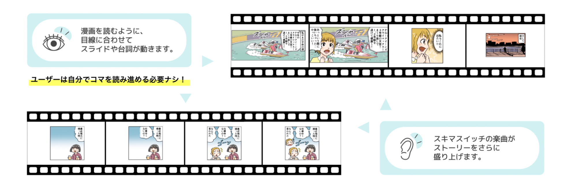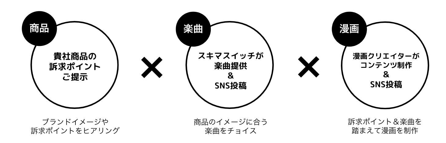 音楽×漫画の相乗効果で、ストーリー性のあるコンテンツを制作し商品・サービスの魅力をPRします。漫画は楽曲や効果をつけた”漫画アニメーション”となるため、自動でストーリーが展開されアニメ感覚で楽しく見ることができます。