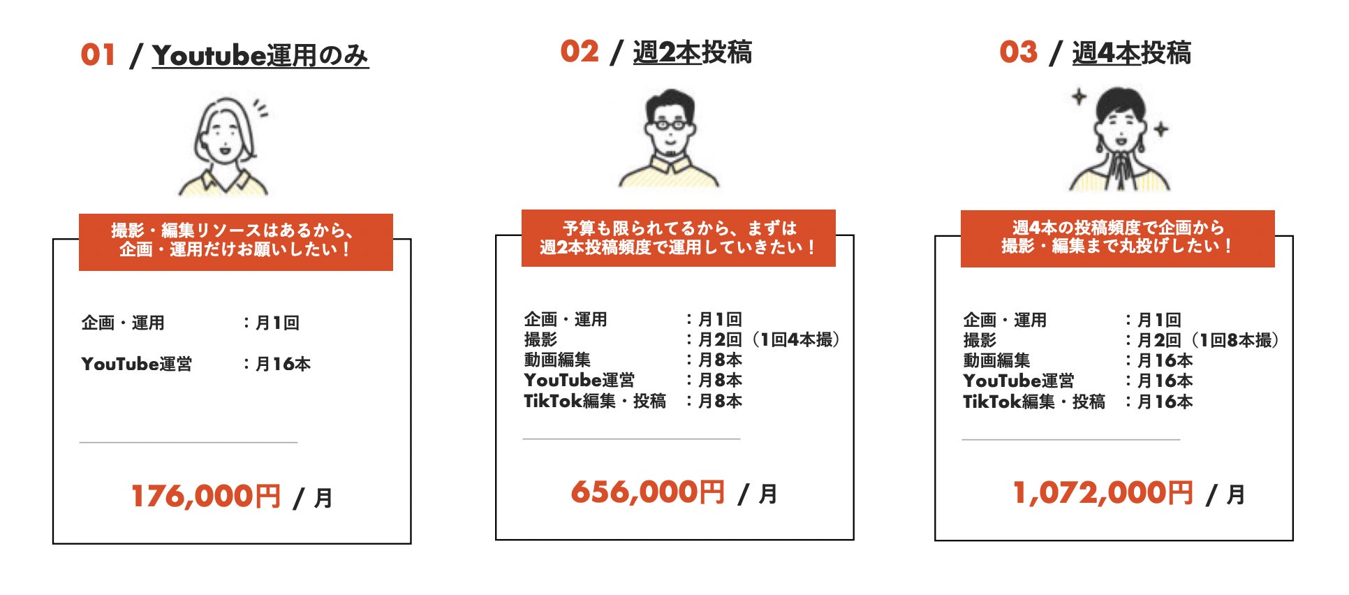 | 1. 制作リソースのはあるので、運用だけお願いしたい →運用のみ:176,000円(税抜) 2. 予算が限られているので、まずは週2本の頻度で投稿したい 3. がっつり週4本投稿して運用していきたい |