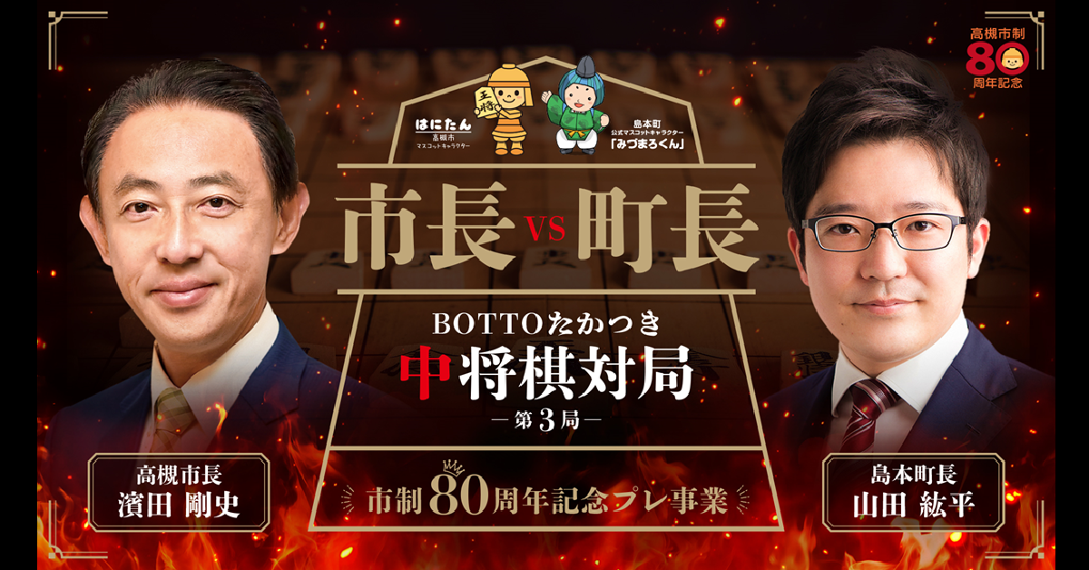大阪府高槻市は、「【市長VS町長】BOTTOたかつき 中将棋対局 第3局~市制施行80周年記念プレ事業~」として、濱田剛史高槻市長と山田紘平島本町長との中将棋対局を実施し、その模様を12月3日(土)17時よりニコニコ生放送で配信します。