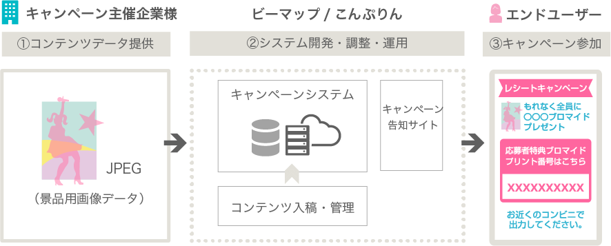 販促キャンペーンの企画やコンテンツ利用の調整が完了し、キャンペーンの実施が確定しましたら、景品にあたるコンテンツデータをご準備ください。以降のシステム開発および運用は、ビーマップ・こんぷりんが行います。