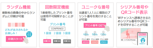 ​ 「こんぷりんPro」をご利用いただくことで、ブロマイドやカレンダーなどマルチコピー機で出力できるコンテンツプリントを景品とする販促キャンペーンを低コストで実施することが可能になります。