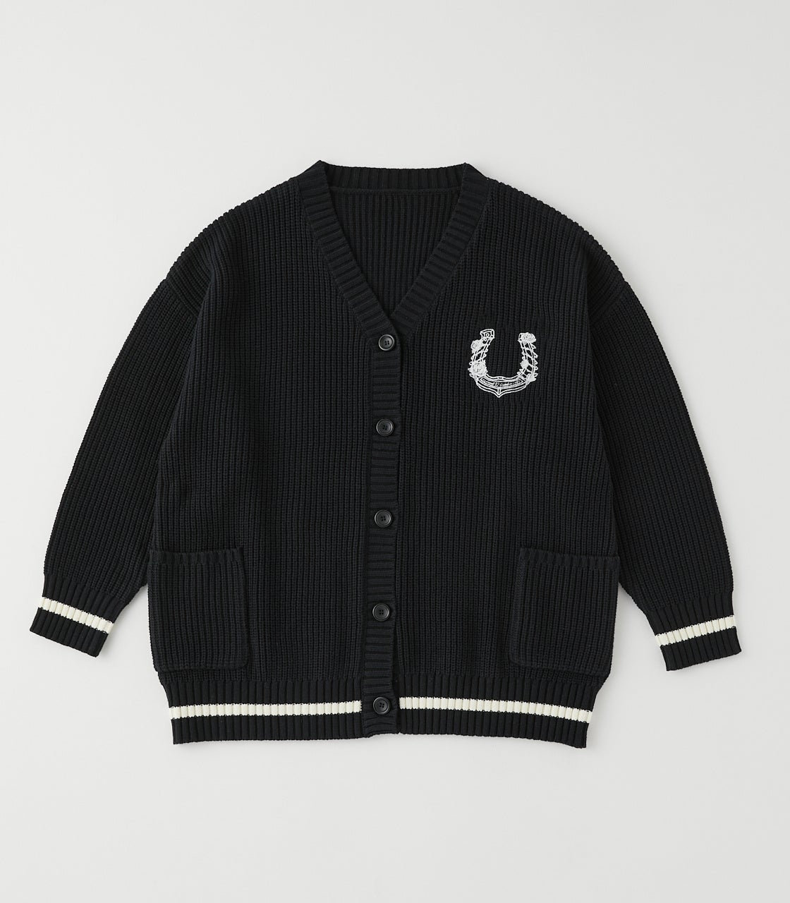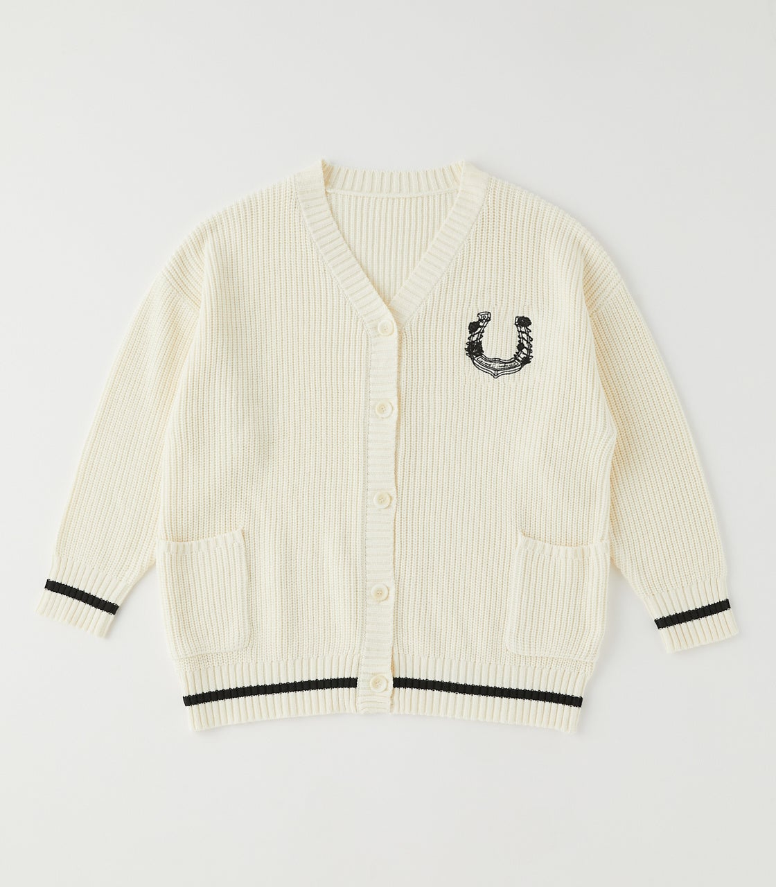 胸に配置された蹄鉄の刺繍とリブの切り替えラインがどこか上品な印象を与えるアイテム。