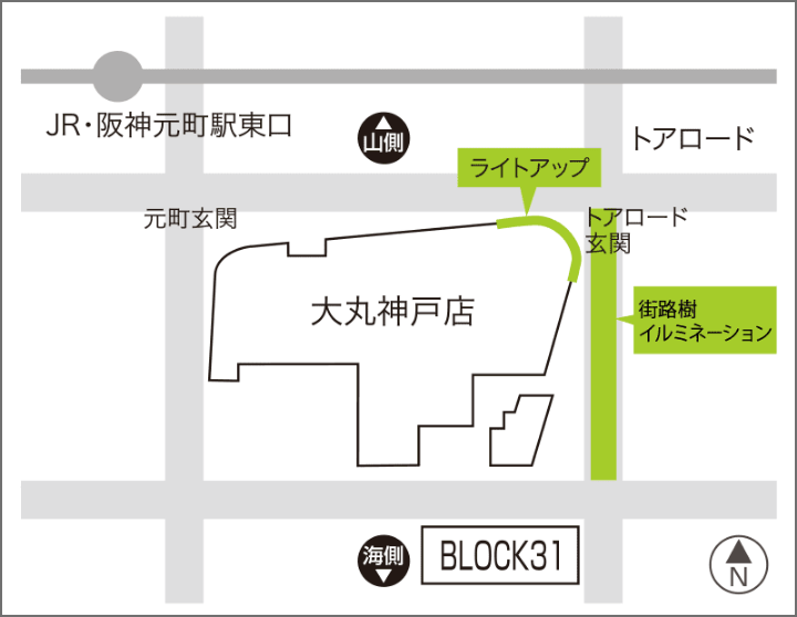 大丸神戸店トアロード側のライトアップとともに、この時期だけのきらびやかな旧居留地の夜をお楽しみください。