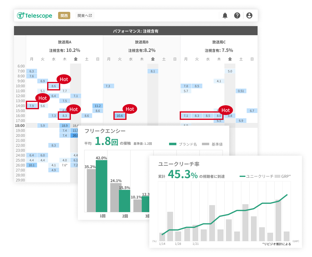 すでにTelescopeをご活用いただいているクライアントから、関東と他のエリアを同じ指標で評価したいというご要望や、自社・競合の出稿量と視聴質データのエリア別でのデータを1ツールで評価できるようにしてほしいというご要望を、多数いただいておりました。